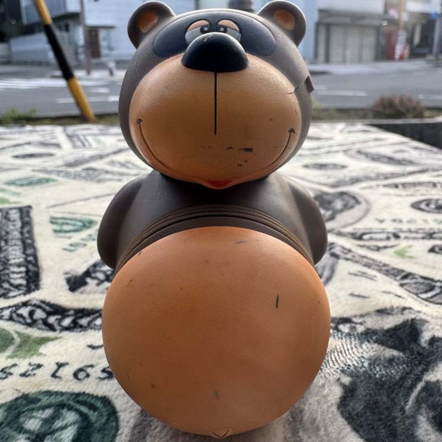 昭和レトロな企業物 ノベルティUsedの富士銀行の 動物貯金箱のご紹介です。 1970年代頃に富士銀行のノベルティとして配布されたソフビ製の貯金箱で昭和レトロなデザインが可愛いだけで無く、アコーディオンみたいに伸び縮みする じゃばら構造となっている為、胴体やお腹の部分が伸びるギミック仕様で のびのび貯金箱と呼ばれています。 こちらでは狸、タヌキの動物貯金箱、のびのび貯金箱のご案内となります。お腹の稼働は浅めですが 今回 唯一の立ち姿で でべそも可愛いw 残念ながら顔の左右と後ろにヒビが入っています。ペイントロスと汚れもありますのでご了承の上、ノークレーム、ノーリターンでご検討下さい。気になる点があればコンタクトフォームよりお問い合わせ下さい。 size:H96 x W63xD74~103mm/ソフトビニール製/¥1800(税込)
