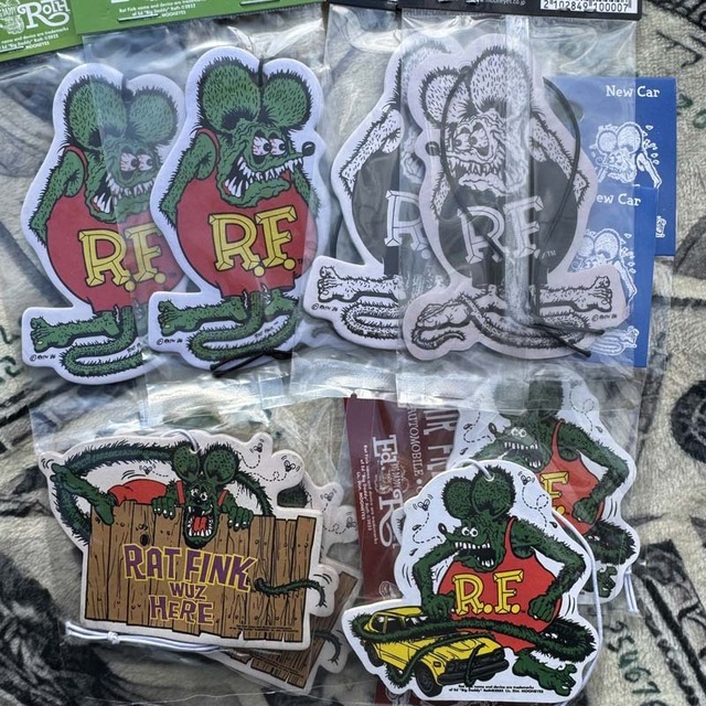 カスタムビルダーの第一人者 Ed Big Daddy Rothこと、エド・ロスが生んだ人気キャラクターラットフィンクデザインのMOONEYES製のエアフレッシュナーのご案内です。 Rat Finkのオリジナルデザイン、モノクロデザイン、Rat Fink wus here ラットフィンク参上 Graffitiデザイン、初代 ホンダ・シビック ?FORF?デザインの4種類が入荷! 1963年 エド・ロスが生み出したネズミの怪物キャラクターのラットフィンクはディズニーのミッキーマウスへのアンチテーゼとして綺麗で可愛いミッキーに対し、汚くて不気味、反逆的なキャラクターのデザインとして誕生! カスタムカルチャー、ホットロッドカルチャー、サーフカルチャー、バイカー、ローブロウアート界など幅白いカウンターカルチャーから支持を集めるアイコン的存在です! 使い終わったエアフレッシュナーもデザインが可愛いんで、そのままインテリアのディスプレイとしてお楽しみ頂けると思います! ◆Rat Fink/Green レモンの香りsize:H 100mm x W 70mm/紙製/Made in china/¥550(税込) ◆Rat Fink/Bk x Wh ココナッツの香り size:H 100mm x W 70mm/紙製/Made in china/¥550(税込) ◆Rat Fink wus here チェリーの香り size:H 67mm x W 98mm/紙製/Made in china/¥550(税込) ◆Rat Fink & car ニューカーの香り size:H 79mm x W 75mm/紙製/Made in china/¥550(税込)