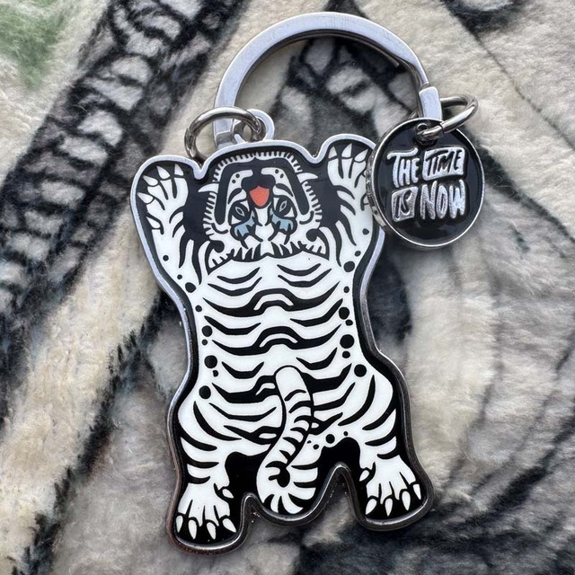 チベタンタイガーをモチーフとしたメタル&エナメルのキーホルダーが入荷しました! 虎はチベット文化において、力と保護の象徴の神聖な生き物とされおり、悪いエネルギーを避け、身に着ける人を災難から守ってくれると言われる事から チベット仏教圏で作られるトラの模様の絨毯 であるチベタンタイガーは、位の高い僧侶のために作られていた由緒正しい敷物となります。 そんなチベタンタイガーをモチーフとしたメタル&エナメルのキーホルダーなんで、身に着けて災難から守ってくれるお守り効果を!ご利益だけで無く、アジアンポップな可愛いデザインはファッションのアクセントとしても◎!THE TIME IS NOW!(その時は今、今こそチャンス)って小さなプレートも付いてます! 本体:約50mm X 34mm、丸タグ:Φ18mm、Wリング:Φ30mm/メタル & エナメル製/¥990(税込)