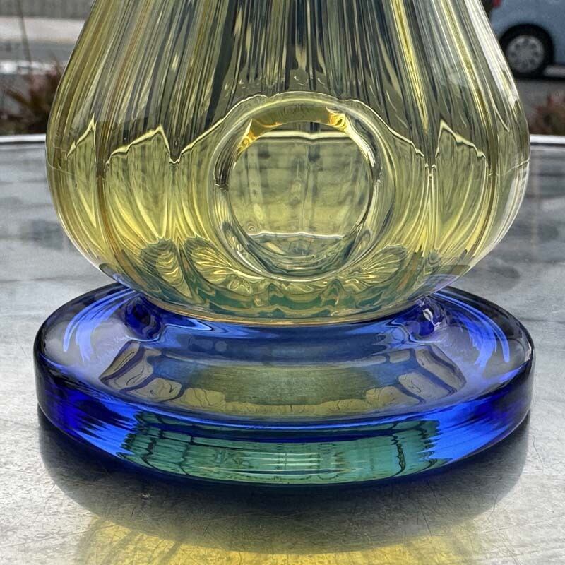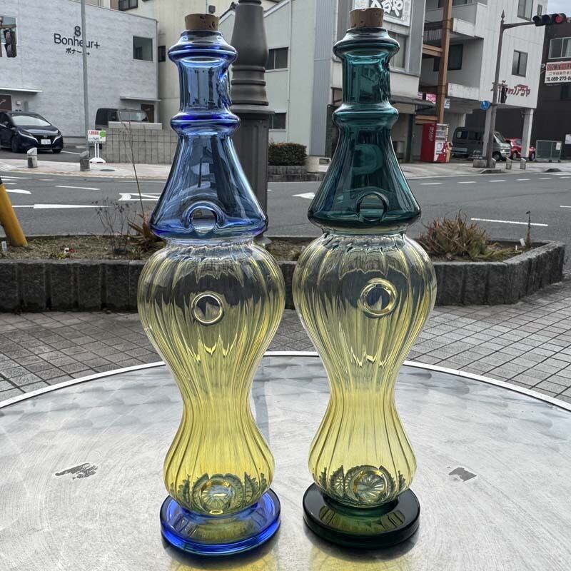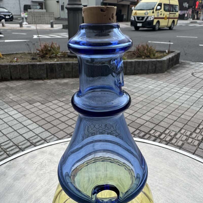 上部と底のガラスは、爽やかなスカイブルー。最近使用していいる新しい色で、気分が晴れるような、すっきりとした明るい色です。