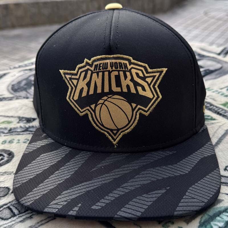 ブラックをベースに、ゴールドのニューヨーク・ニックスのロゴワッペンが付き、