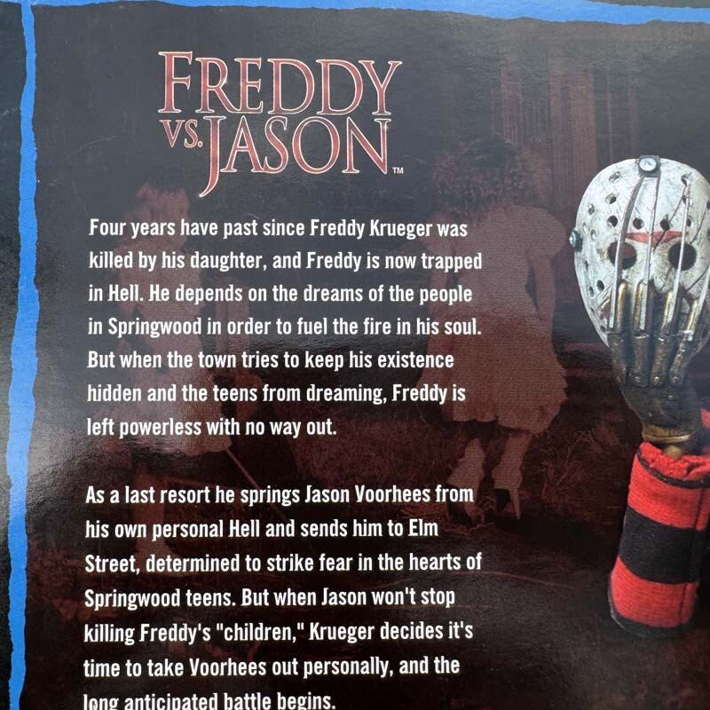 Four years have past since Freddy Krueger was killed by his daughter, and Freddy is now trapped in Hell. He depends on the dreams of the people in Springwood in order to fuel the fire in his soul. But when the town tries to keep his existence hidden and the teens from dreaming, Freddy is left powerless with no way [out.As](http://out.as/) a last resort he springs Jason Voorhees from his own personal Hell and sends him to Elm Street, determined to strike fear in the hearts of Springwood teens. But when Jason won't stop killing Freddy's "children," Krueger decides it's time to take Voorhees out personally, and the long anticipated battle begins.