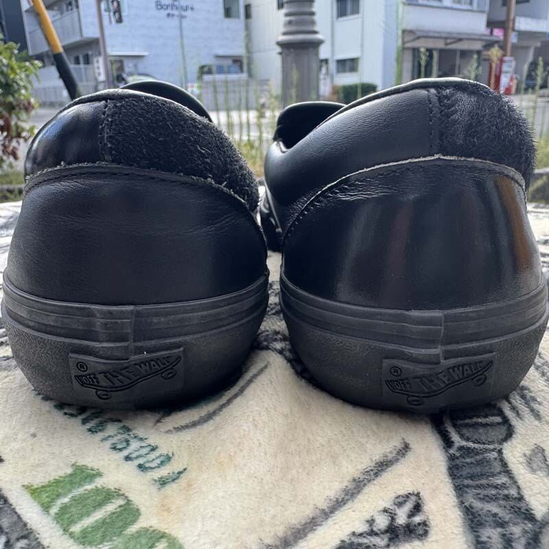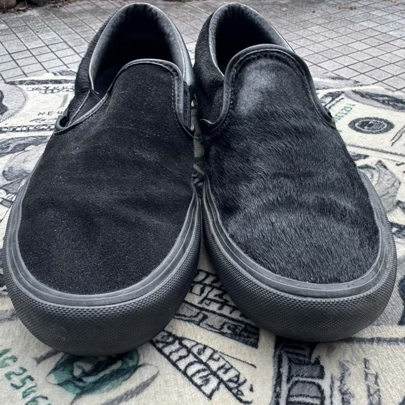 Used VANS × Engineered Garments VAULT SLIP ON US 9.5inch(27.5cm)、バンズ×エンジニアードガーメンツ コラボ スリッポン、左右非対称 スムースレザー、スウェード、ハラコ、パテントレザーの4種のレザーを使ったクレイジーパターン