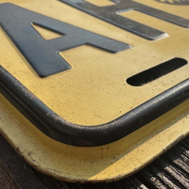 メタル製で,このナンバープレートに関しては、国が支給するナンバープレートでは無く、サイズも一回り大きくカーイベント等で、使うのかな?詳細不明です。