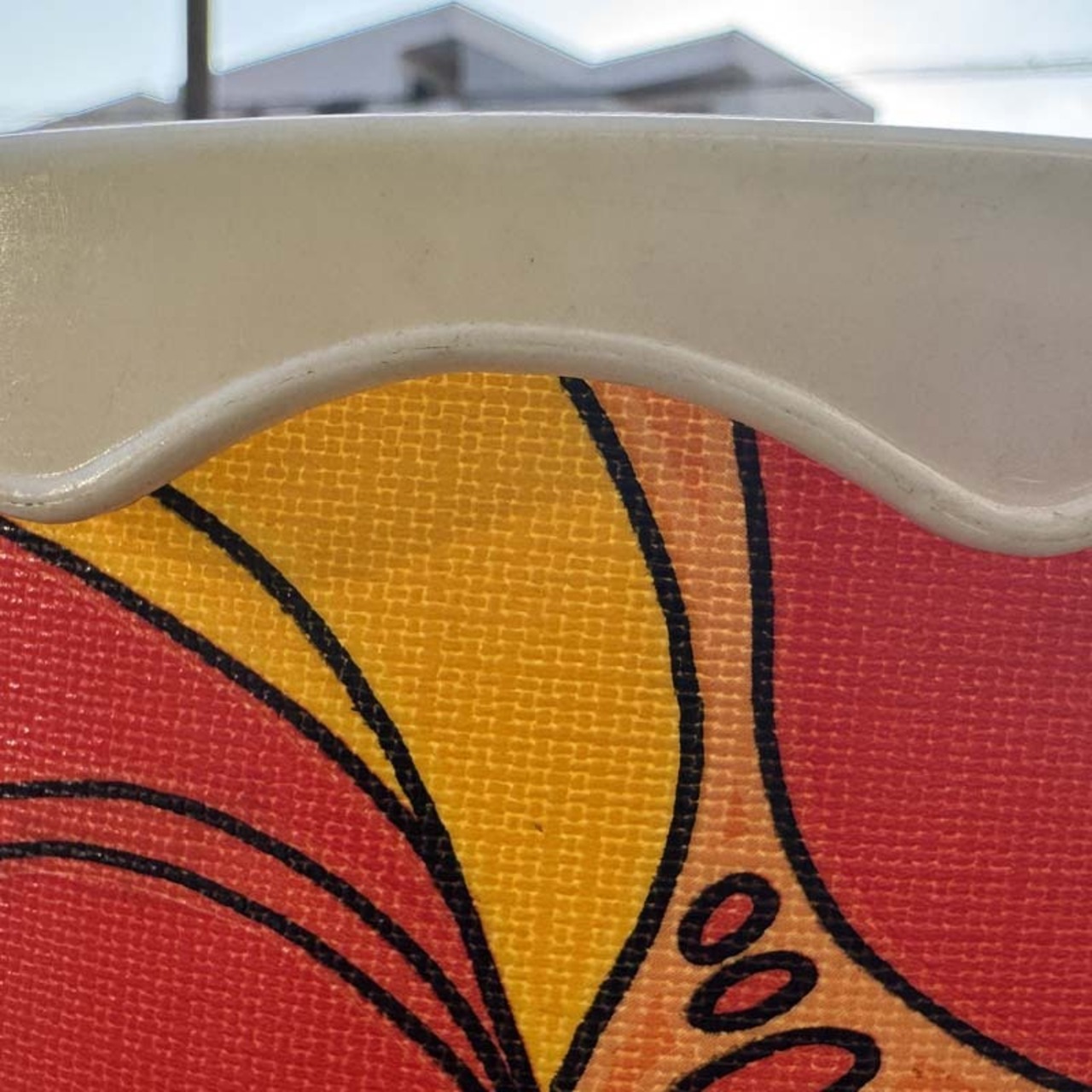 チューリップをモチーフとした花柄のテキスタイル、オレンジx赤x黒の配色もセブンティーズ感満点ですね!ふちの波型デザインも可愛い!