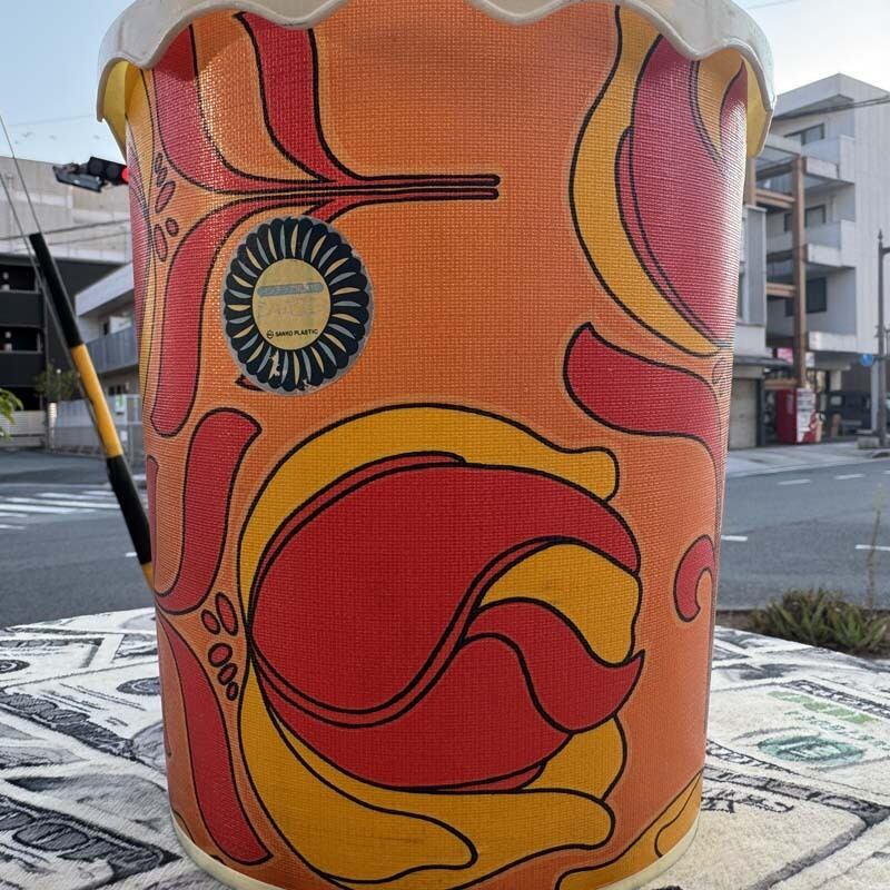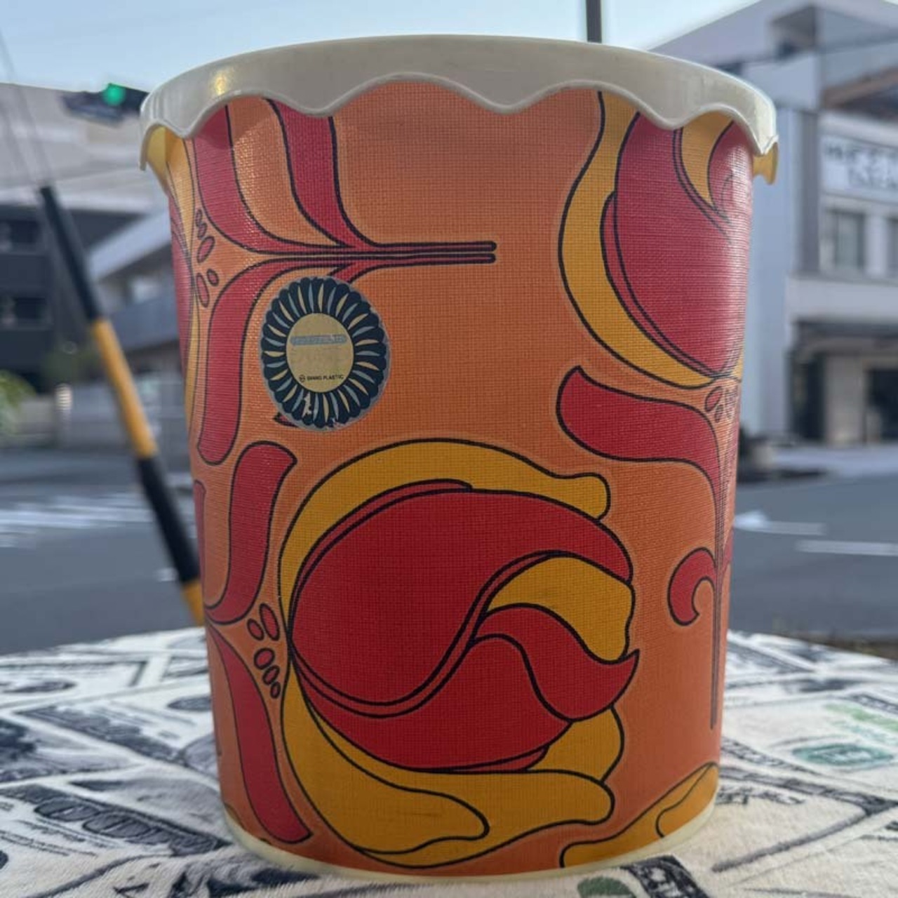 プラスチック製のゴミ箱となりますが、当時の花柄デザインにインテリア屑入れ シャロン SANKO PLASTICのステッカーも残っており、汚れや日焼けなど目立つダメージも見当たりません。