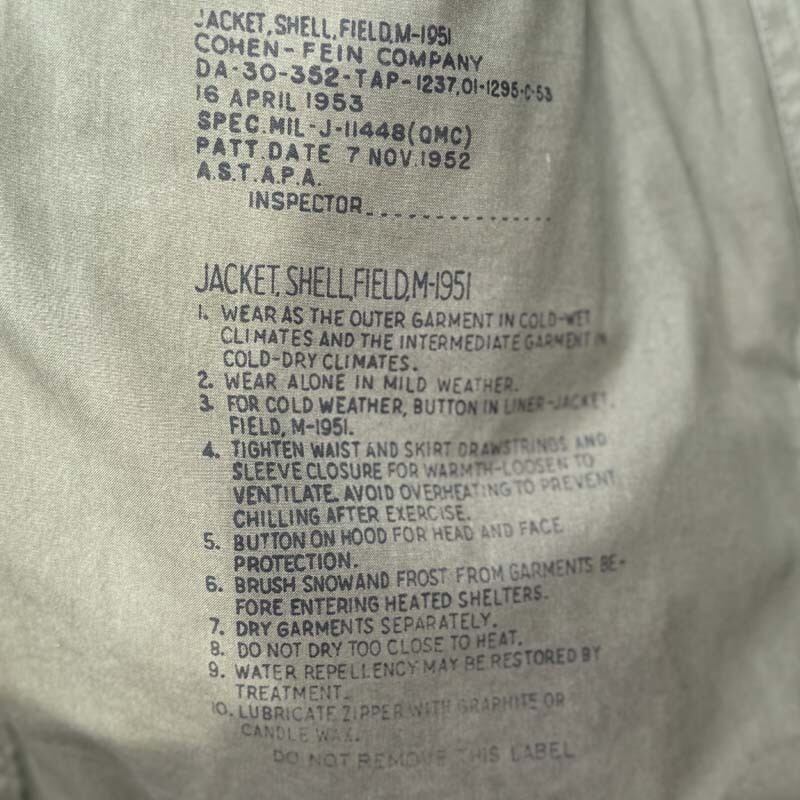 フィールドJKTというと、M65が有名ですが、そのM-65の以前に採用されていたアイテムで、こちらは、1953年製のM-1951 Field JKTとなります。