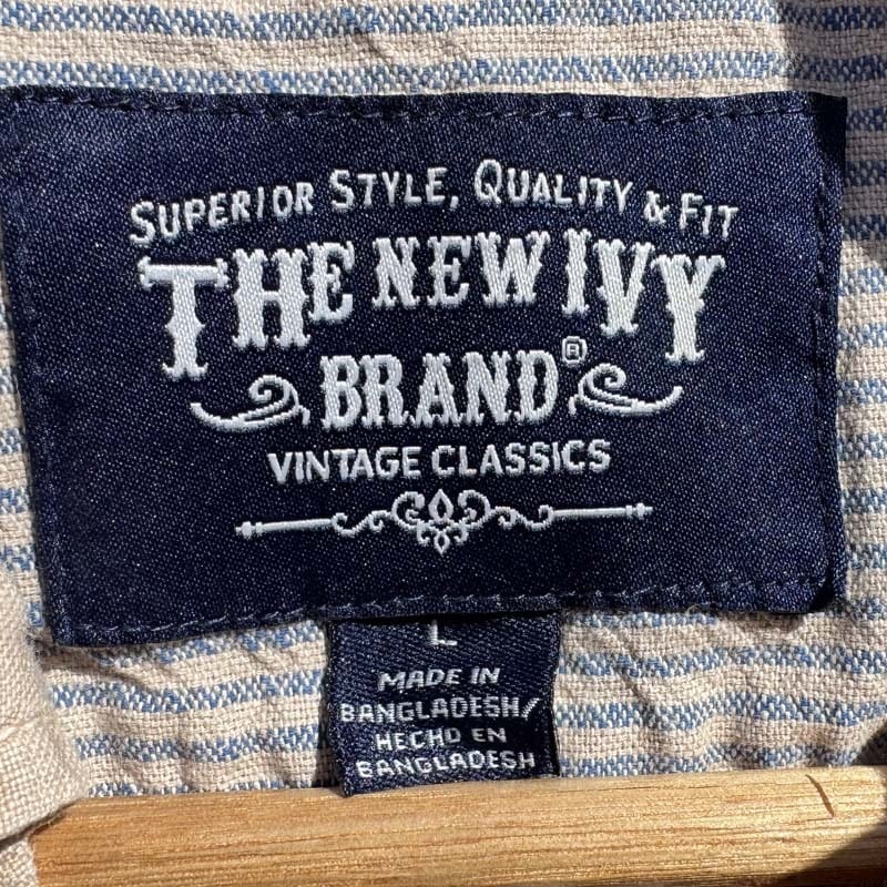 ナチュラルカラー、生成りのリネン素材のボタンダウンシャツでLサイズ、THE NEW IVY BRANDというブランドのタグが付いています。