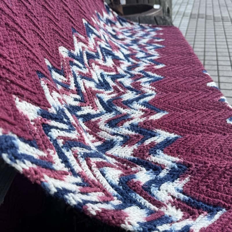Wine × White x Navyと3色の毛糸を使用したジグザグ模様が編み込まれた手編みのブランケットで、左右両サイドは真っ直ぐ上下は、ジグザグの仕上がりです。