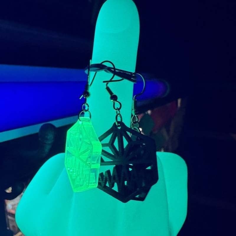 こちらは集光アクリル素材を使用した蛍光イエローのピアスで、ブラックライトで光る仕上がりとなっています。
