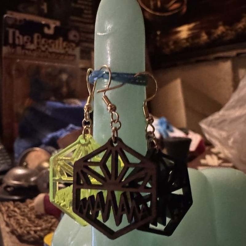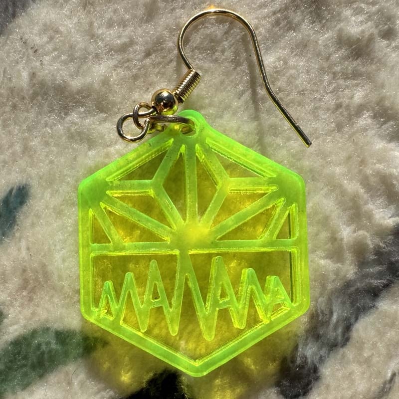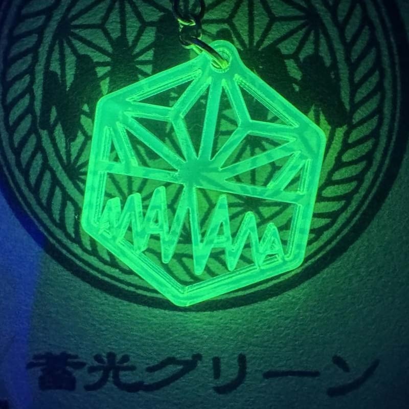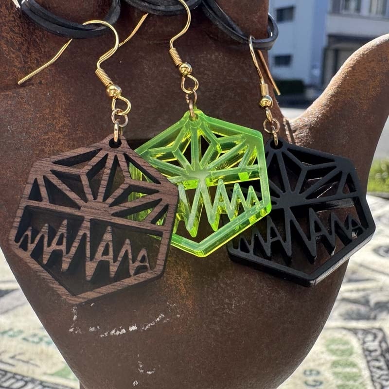 manana x アサガラワークス mananaロゴx 麻の葉文様のピアス、ブラックライトで光る 蓄光蛍光イエロー(集光アクリル素材 ) x 金属アレルギー対策にも有効なステンレス素材 | manana