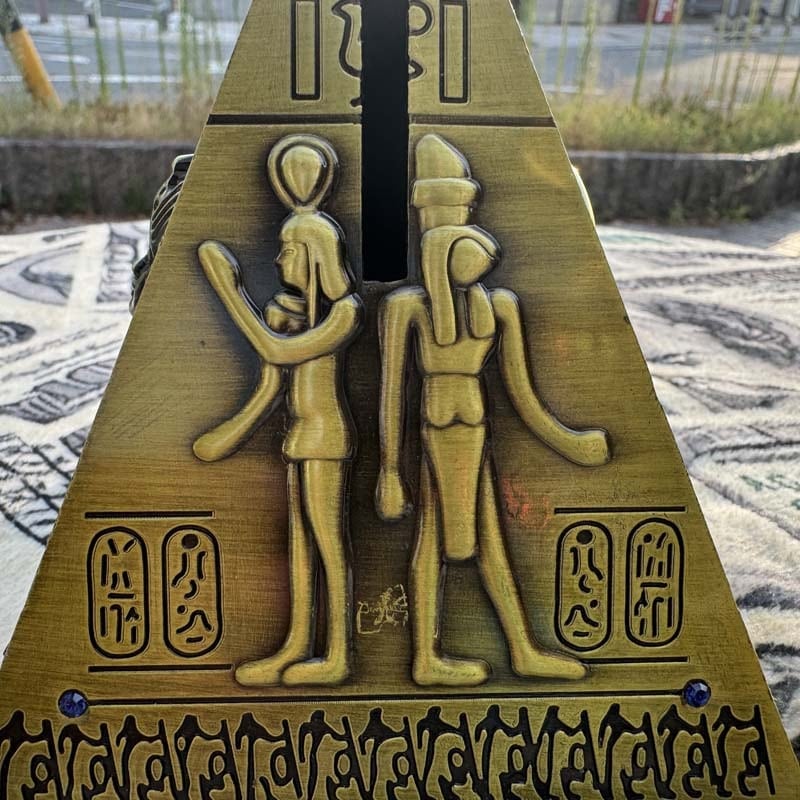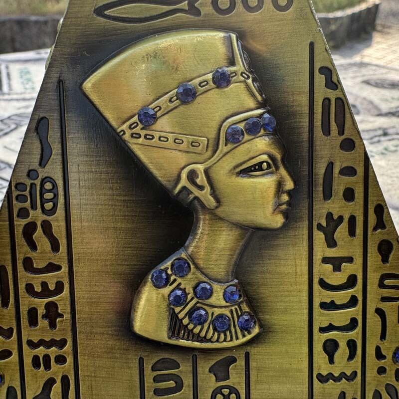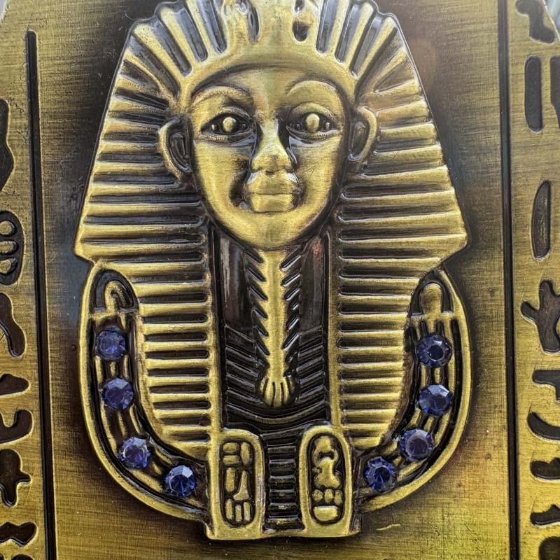 ビンテージの雰囲気漂うブロンズ色のメタルにヒエログリフ(古代エジプトで用いられた象形文字の一種)、ツタンカーメン、クレオパトラ、ネフェルティティ王妃、古代エジプトの神々(イシス女神、オシリス神)などが立体で入ります。