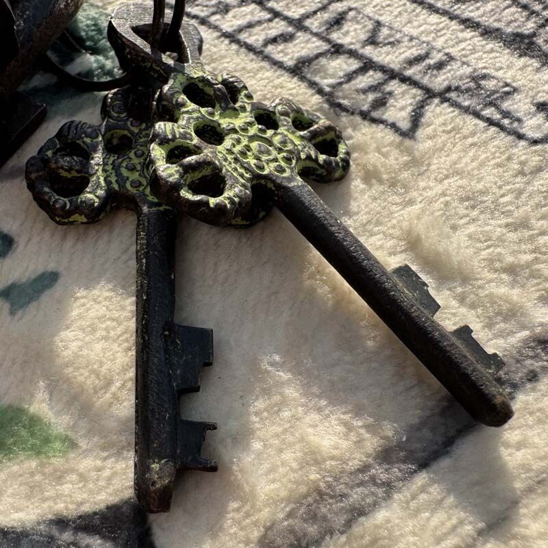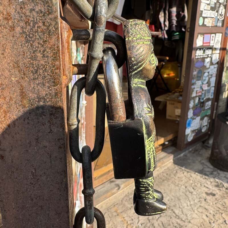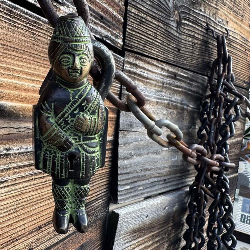 扉を閉じるって 鍵本来の防犯上の意味よりも、その存在感、雑貨感を楽しめる大きなメタル製の鍵は、インドの植民地時代の名残り、クルッ回って考えてみると、重くて、でっかくて、こんなにアンティーク、レトロな存在感なのに、鍵をかけられるって考えてみると、なんだか得した感じになりますよね?w