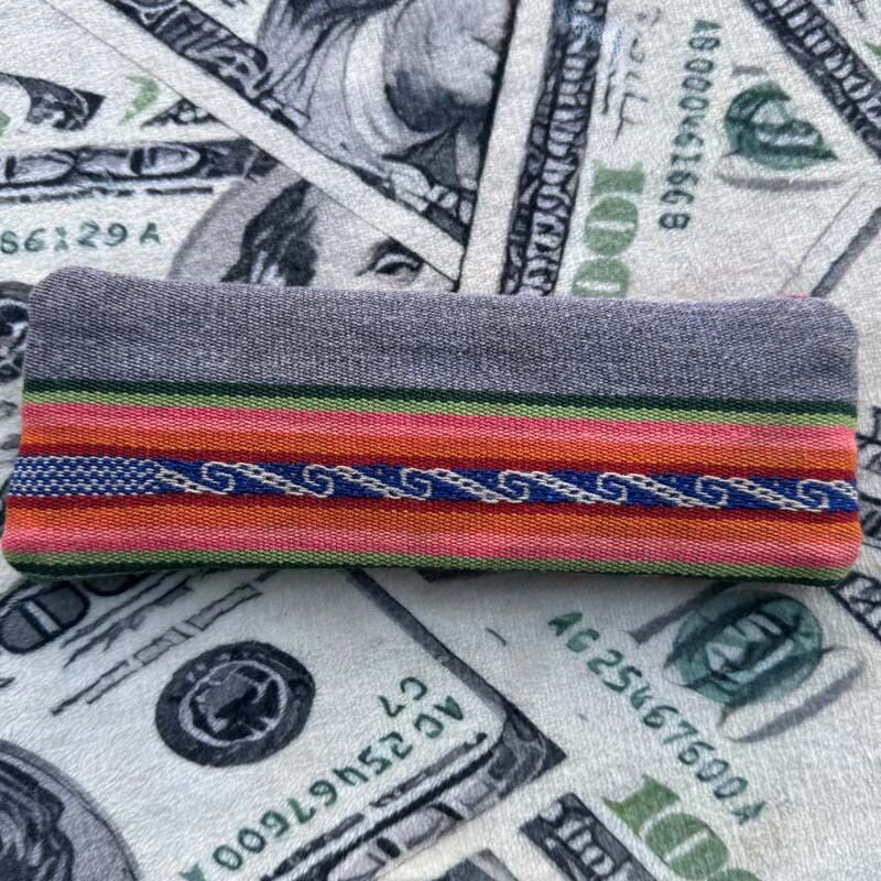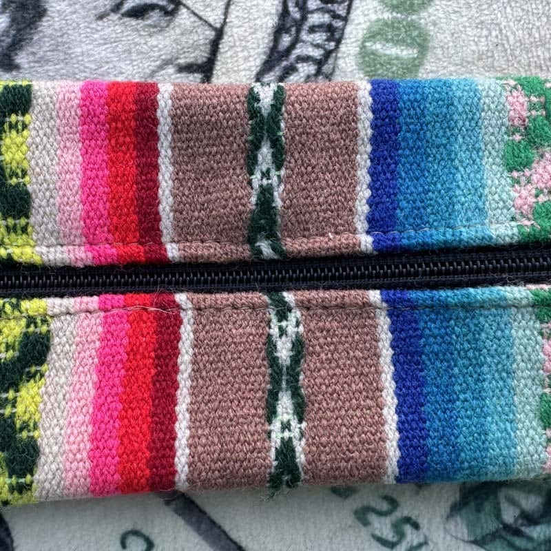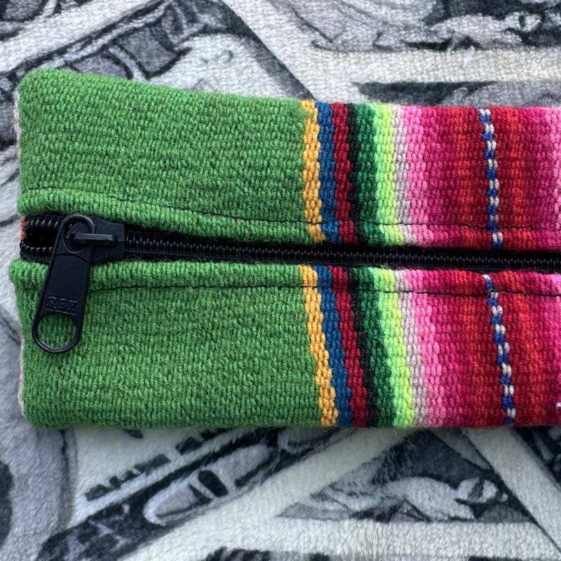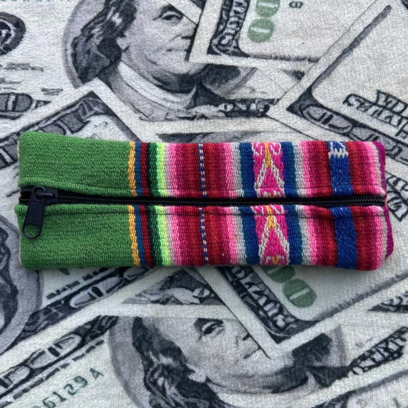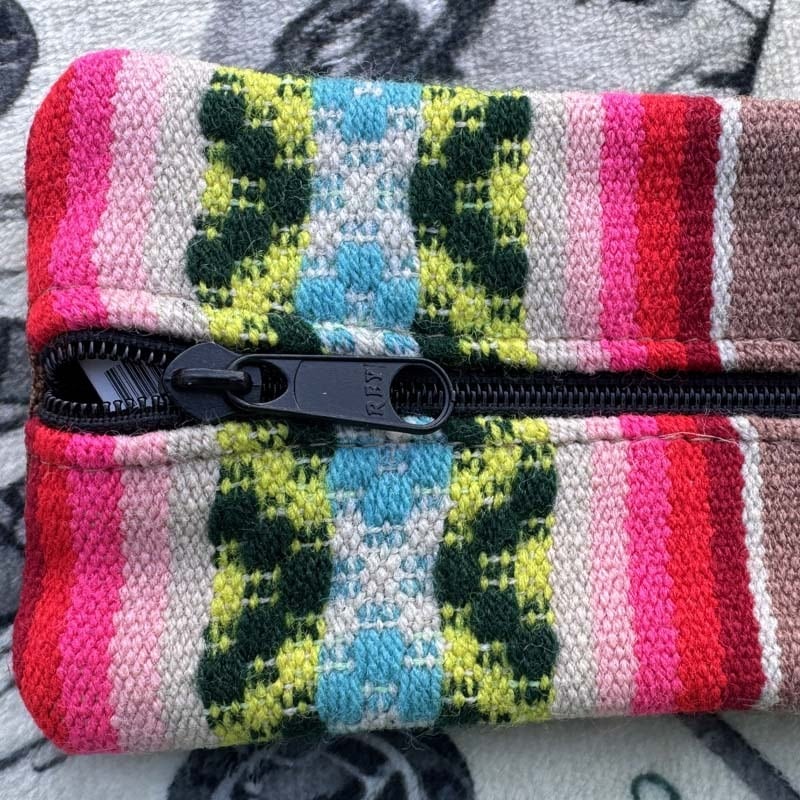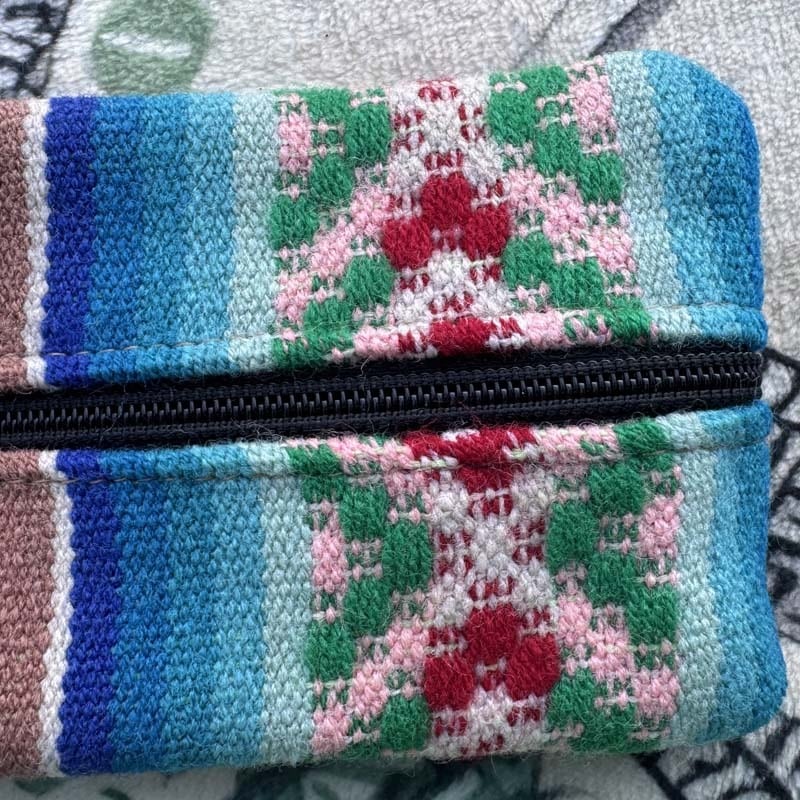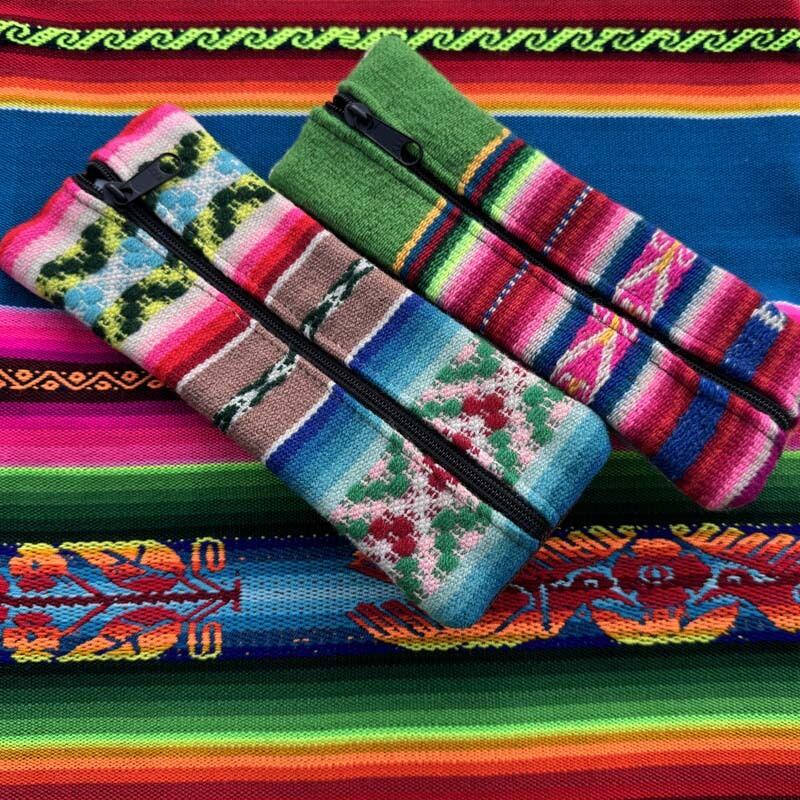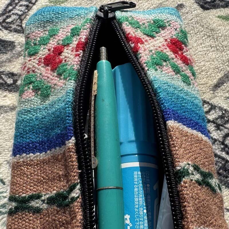 羊やアルパカなどの毛糸で作られることが多いみたいですが、こちらはウール x アクリルmix となります。カラフルで鮮やかなボーダー柄や、幾何学模様などが特徴的。バッグやアクセサリーなどの雑貨に加工される事も多く、こちらはペンシルケースとなります。筆記用具以外の小物入れとして、バックに入れておいても重宝すると思います。