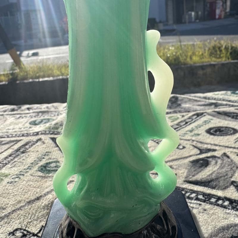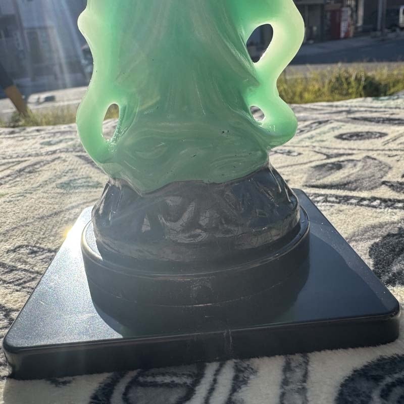 宗教的な儀式用なのかなと思いますが、翡翠色がとてもいい感じで装飾品、置物としてのディスプレイにもありかなと思います。プラスチック製の台座が付くので 上の パッケージを外して貰えれば気にならないと思います。