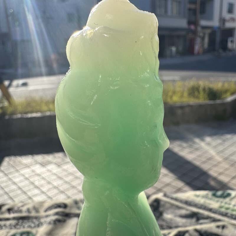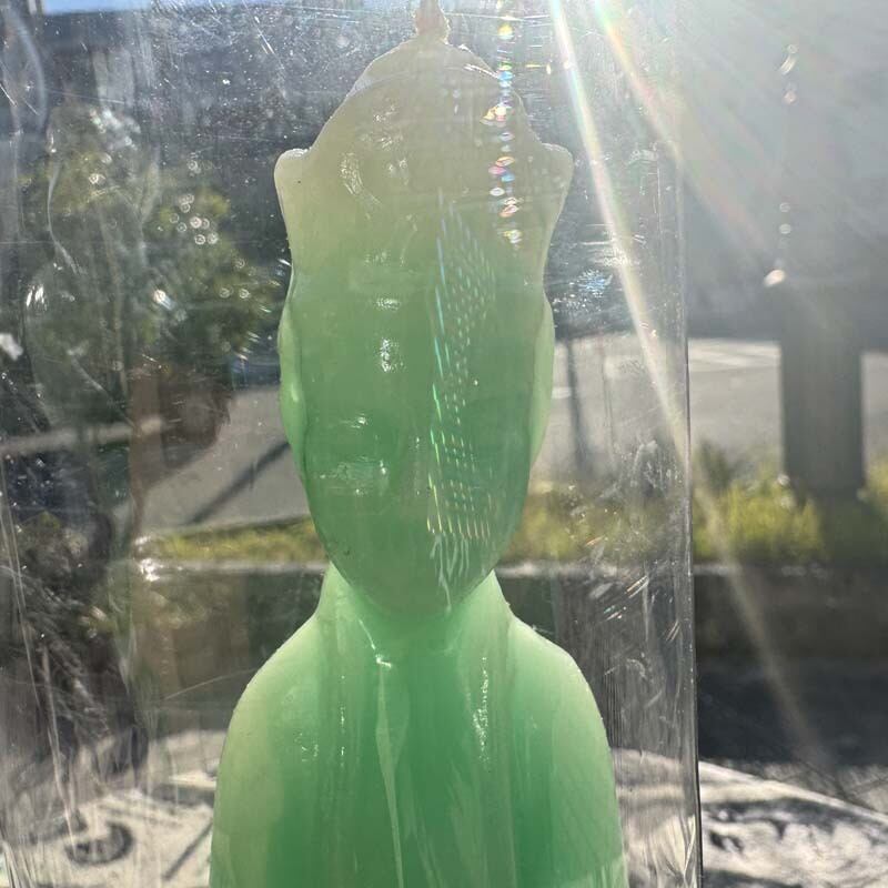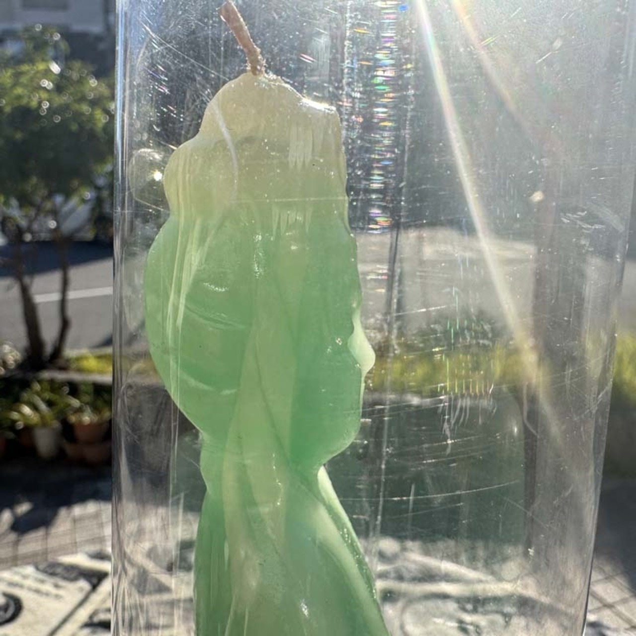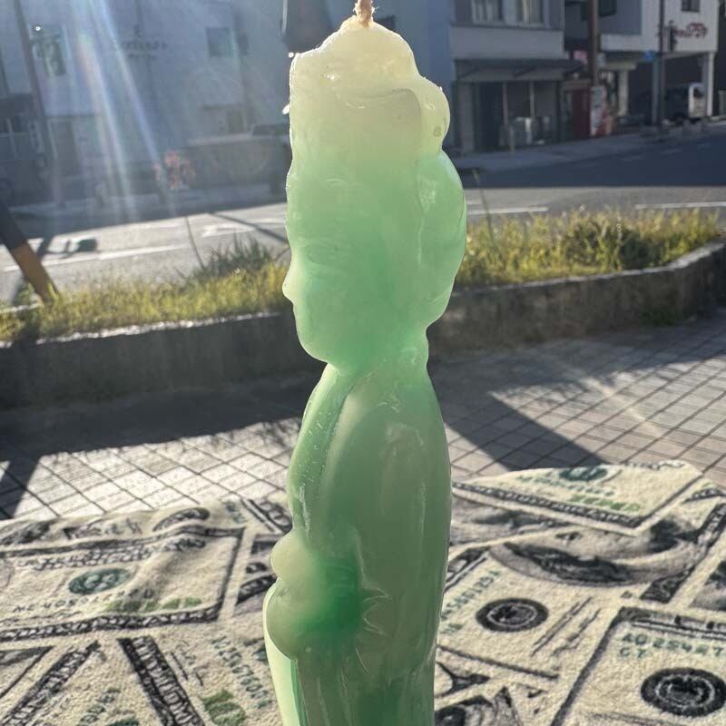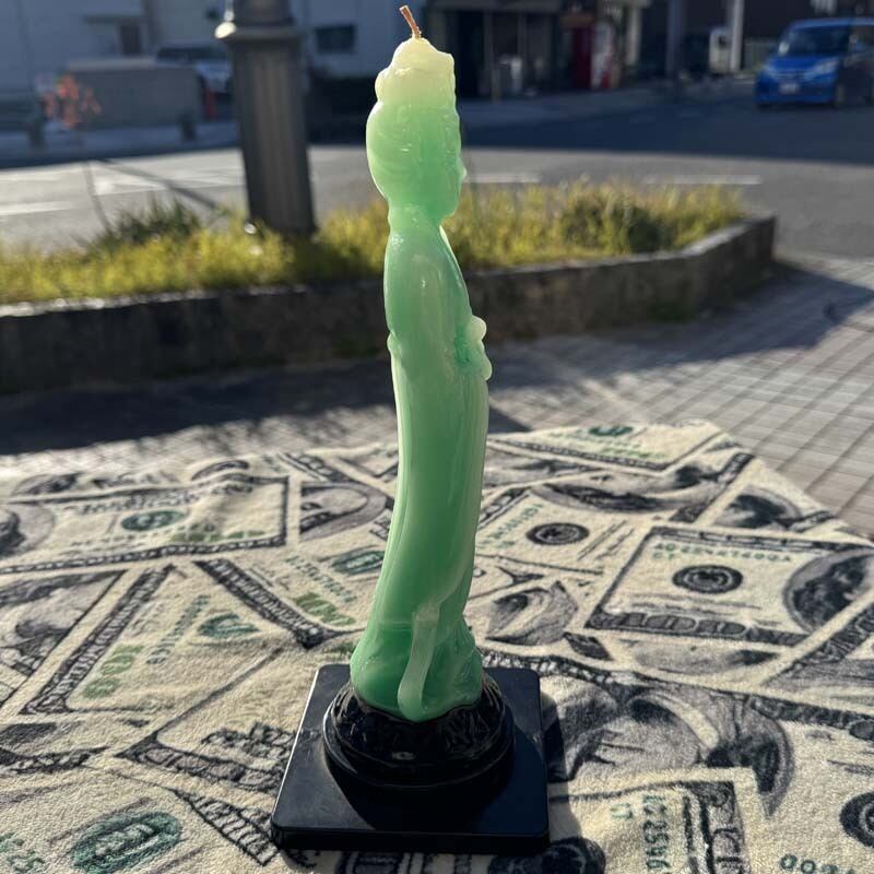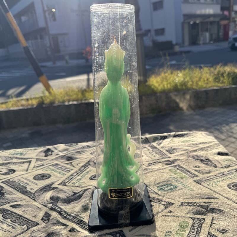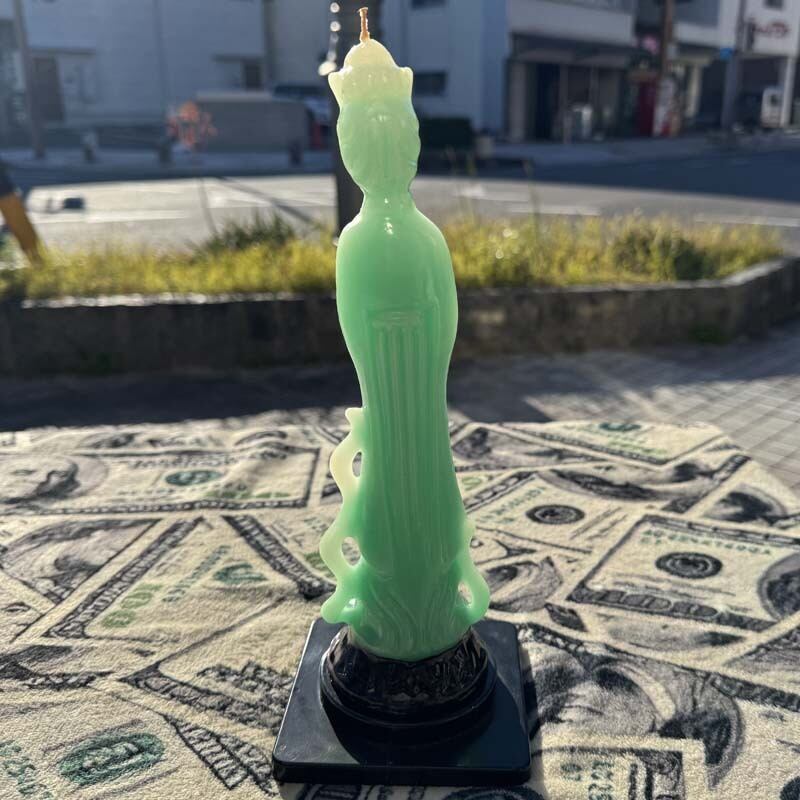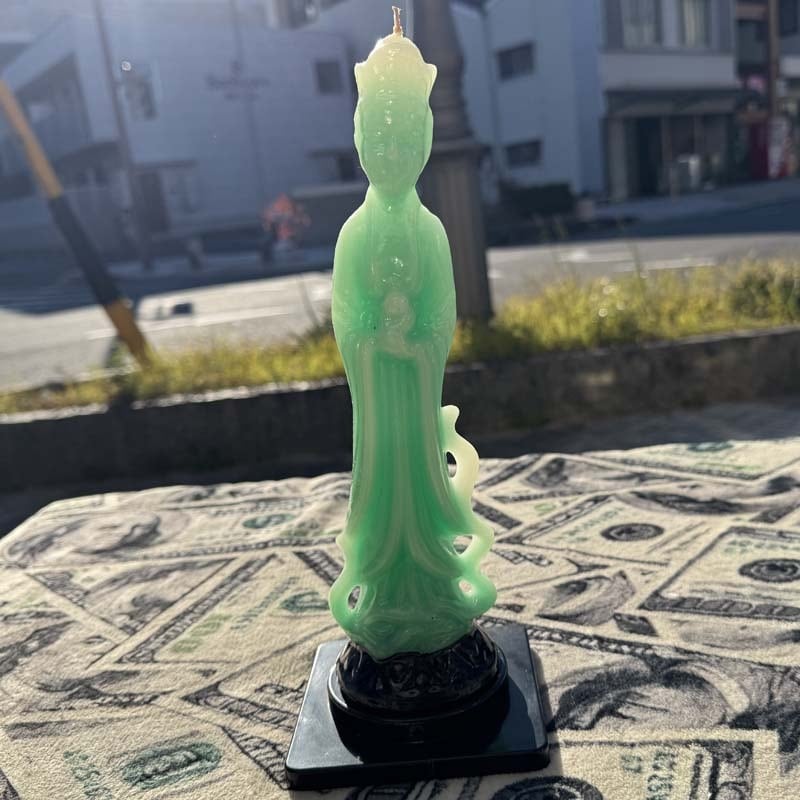 カメヤマローソクの観音菩薩をモチーフとした翡翠色のキャンドルのご紹介です。