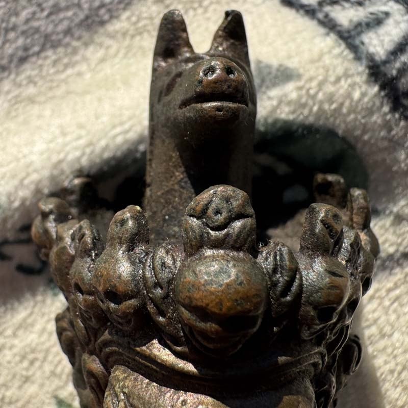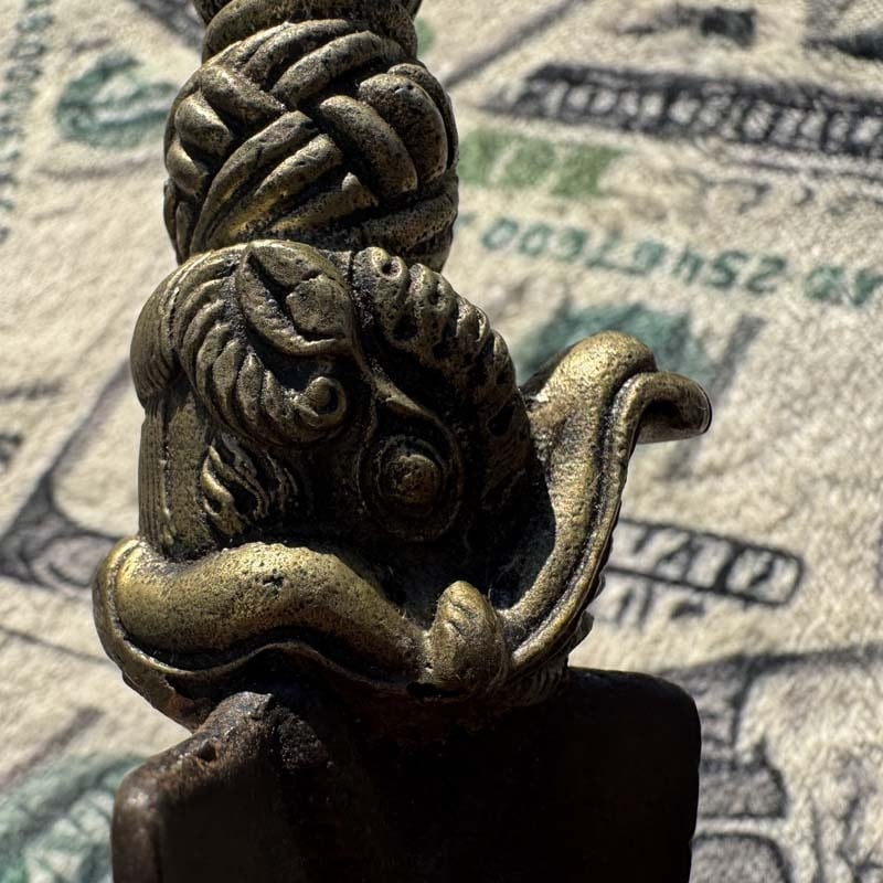 こちらは頭にキツネが乗った 阿修羅の顔がデザインに組み込まれた 剣のような形状のプルパ(Phurba、独鈷剣、金剛杭)タイプです。古代インドの武器を法具化したもので、形状が矢や杭に似ているので「魔法の矢」とも呼ばれます。