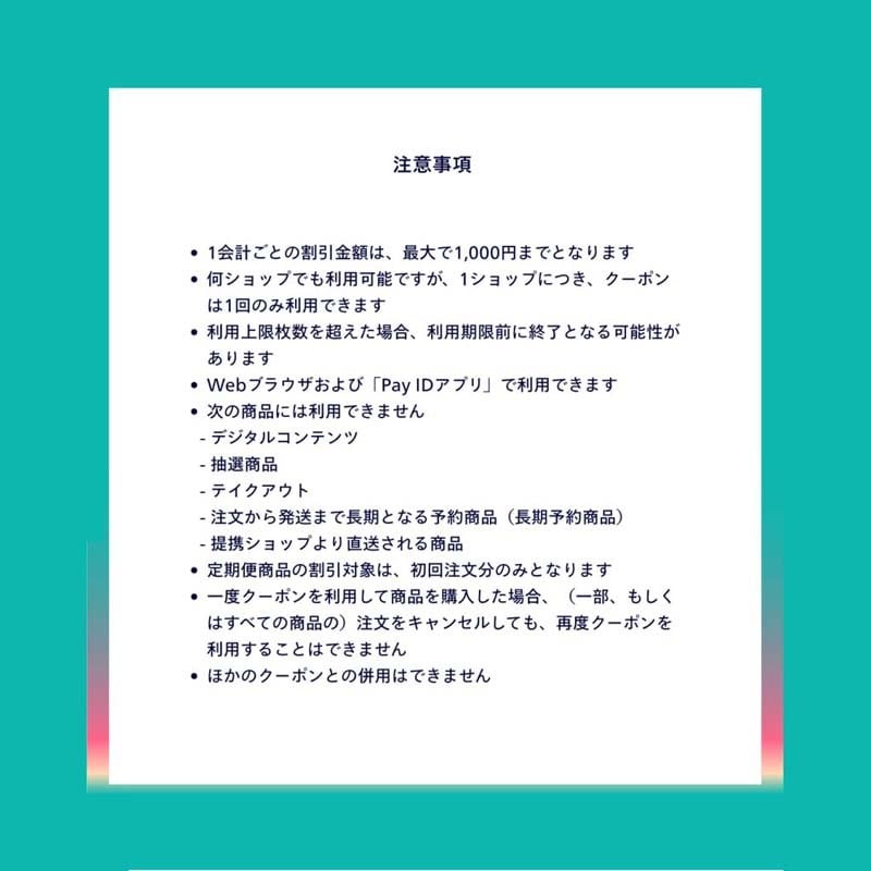 ※クーポンは何度でも(=複数ショップで)使用できますが、1ショップにつき1回のみ使用できます。