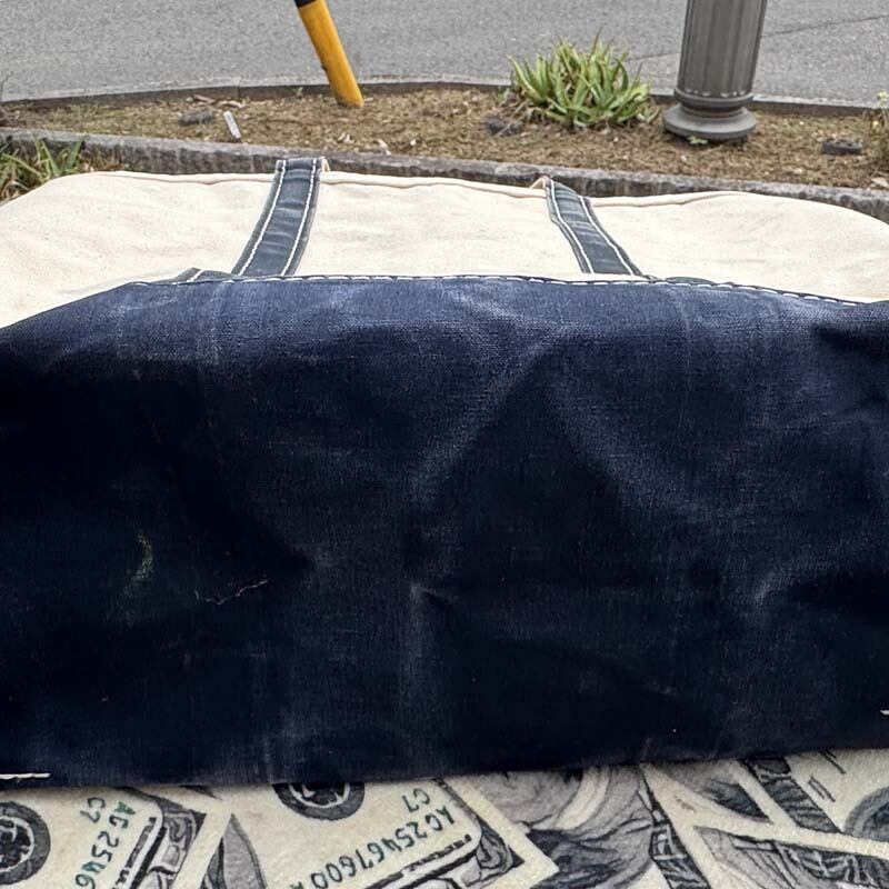 L.L.Beanのビンテージ好きならご存じかと思いますが、現行品に比べてハンドルの取り付け間隔が狭かったり、サイドに青いガイドラインが入っていたり、タグの上下がギザギザになっており Made by L.L.Bean FREEPORT,MAINEが緑刺繍 BOAT AND TOTEが青刺繍で入る2トーン・ギザタグが採用されていたりmade in USA 80年代のボート・アンド・トート、ビーントートのディティールを兼ね備えた逸品なんで、Vintage、Old物をお探しの方是非!