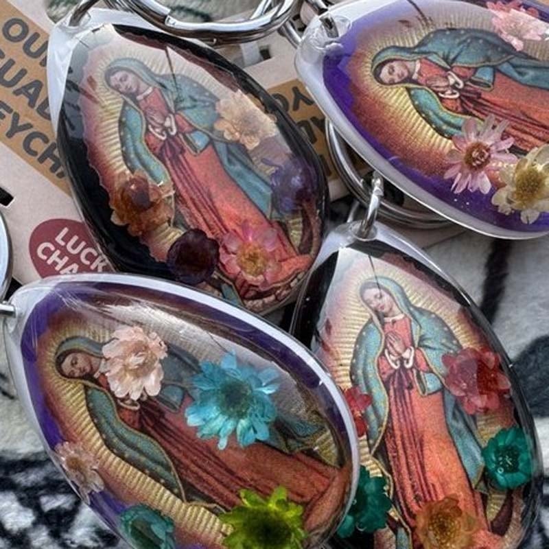 メキシコのグアダルーペマリアを本物の花5輪で飾り樹脂加工して固めたハンドメイド感のあるキーホルダーが登場!
