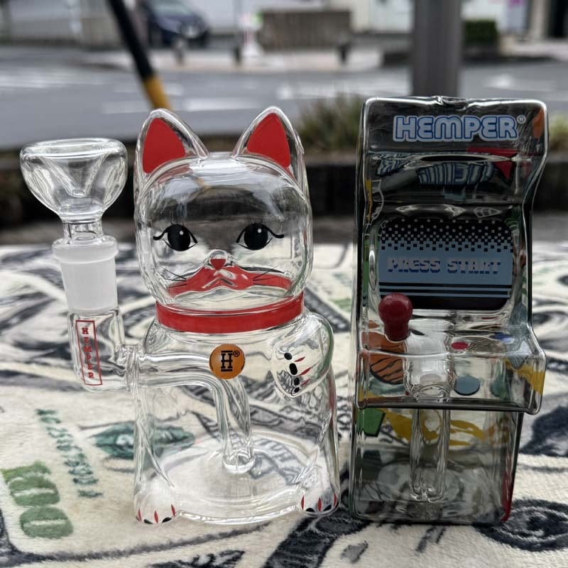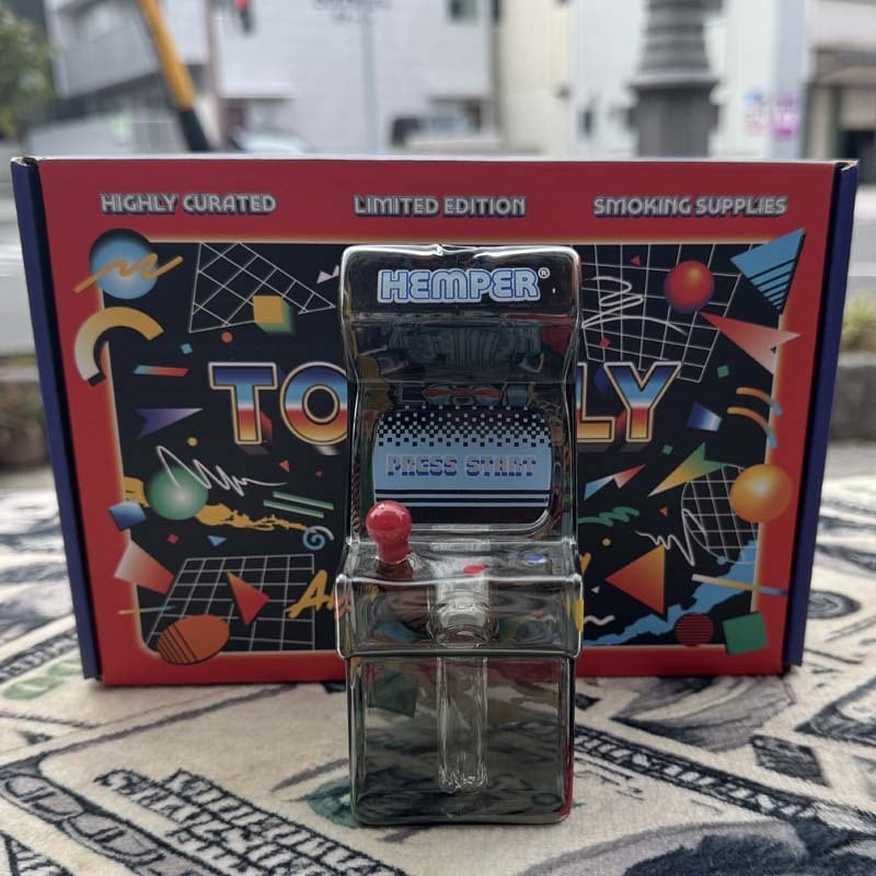 HEMPERの招き猫デザインのガラスボングに続いて、ノスタルジックなグラフィックデザインを搭載した筐体型のミニアーケードゲームマシン仕様のガラスボングが登場!