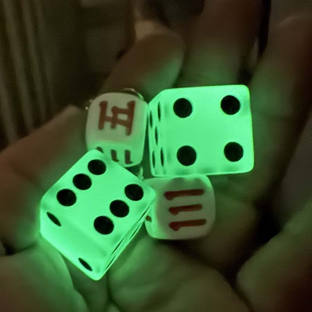 Glow in the darkカラーがあったので、チートでブラックライトで照らしてみたら白い漢字サイコロも光りましたw