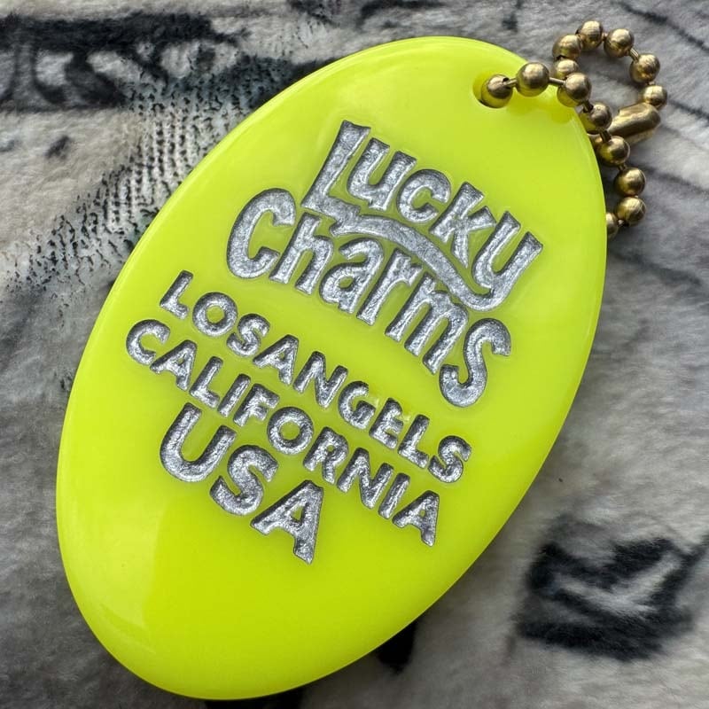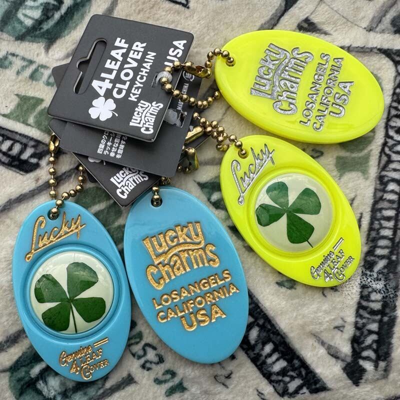 アメリカの販促で使用されていたFour leaf cloverを元ネタに昔ながらのエンボスプリントで立体感を表現して、表面にはLucky Genuine 4 LEAF CLOVER、裏面にはLucky Charms LOS ANGELES CALIFORNIA USAの刻印が入ります。堀が深い凹凸感にレトロ感、高級感 upな仕上がりです。