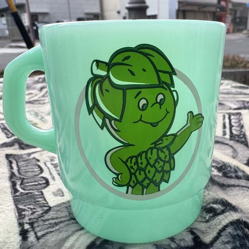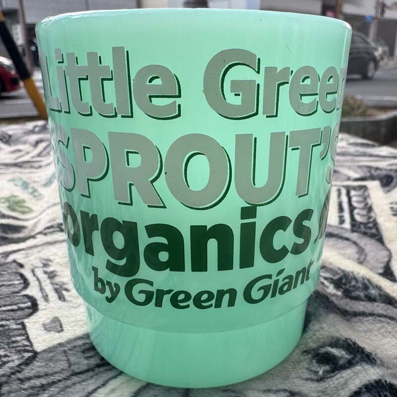 アメリカの食品加工会社 グリーン・ジャイアント社のマスコットキャラクタースプラウトくん。野菜の精霊「グリーン・ジャイアント」のお供で、2頭身で大きな頭とピンクのタスキが特徴の、1970年代から親しまれている人気のビンテージキャラで 名前の通り新芽(Sprout)を象徴しており、髪の毛が葉っぱでできています。これは植物の生命力と成長を表現しています。