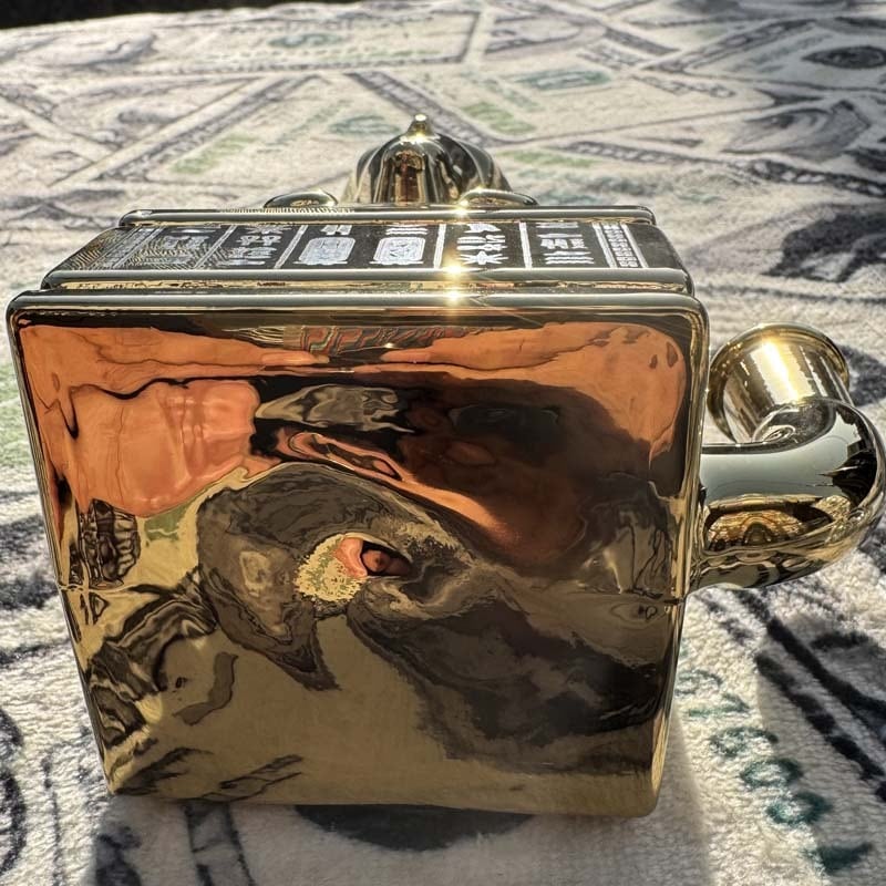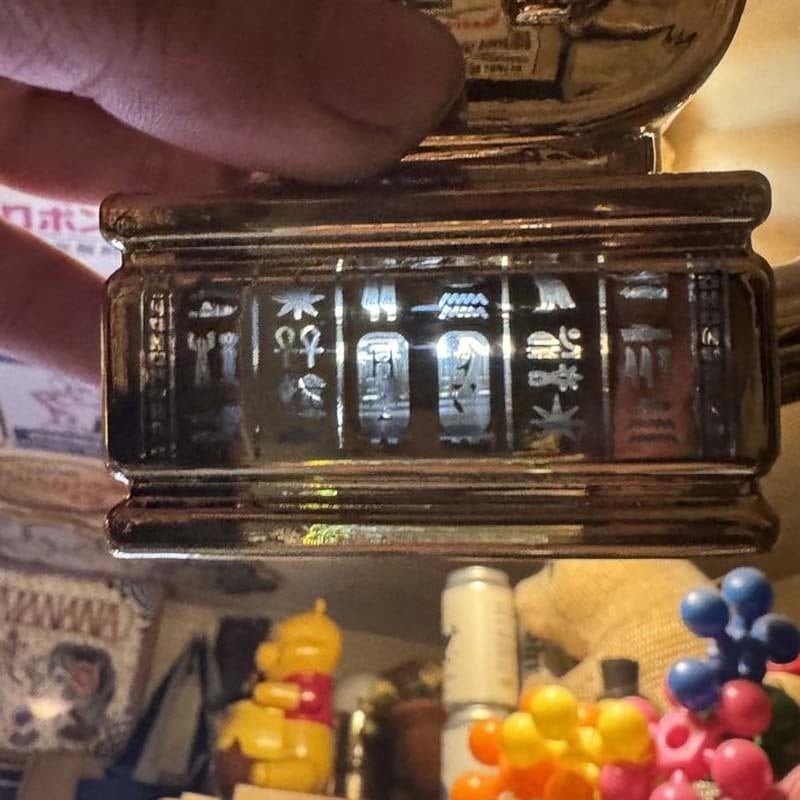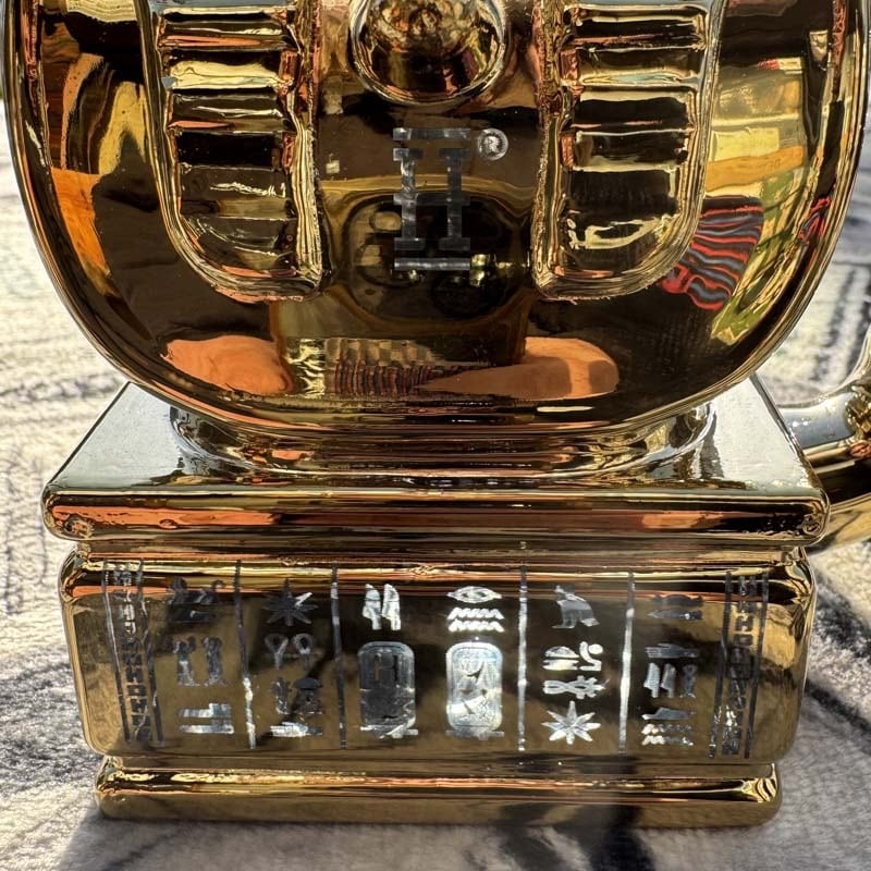 全体的にバキバキのゴールド塗装がインパクト抜群な仕上がりですが、下部分のピラミッドに刻まれた象形文字、ヒエログリフの部分と裏面のHEMPERのロゴ部分は抜染プリントのような塗装しない仕上がりなので透き通ってみえる仕上がりとなっています。