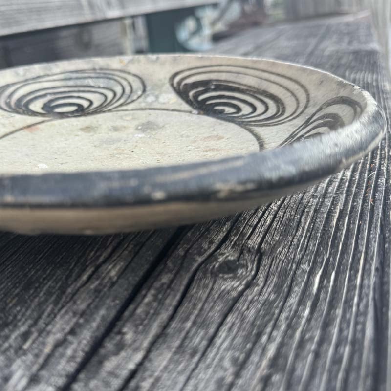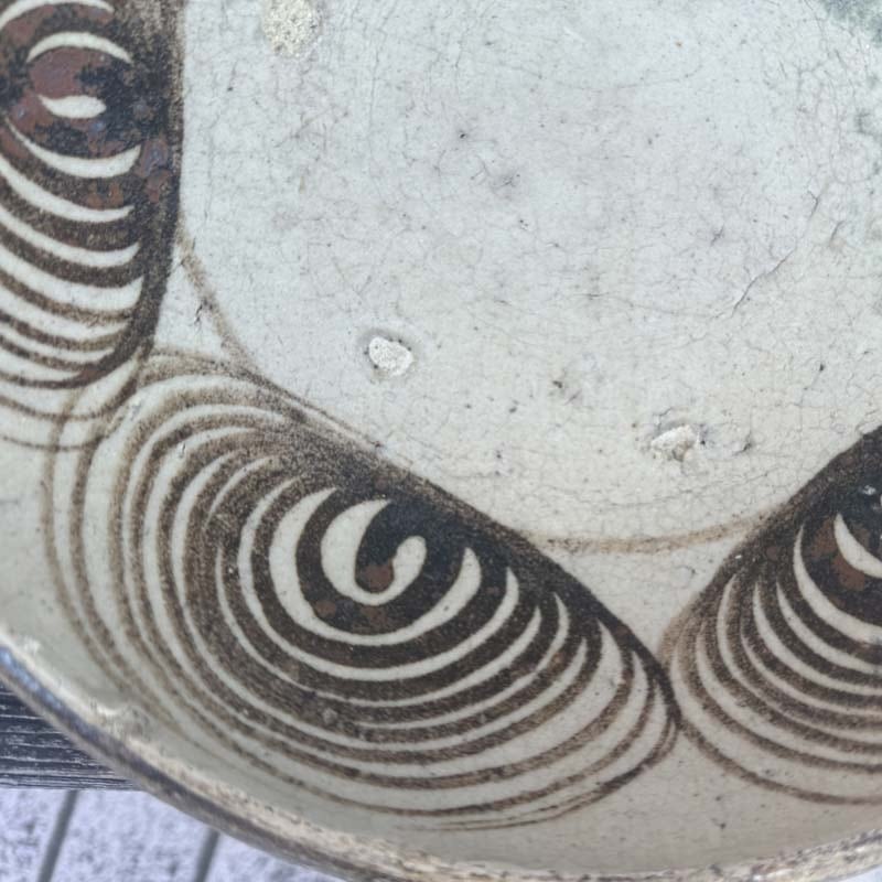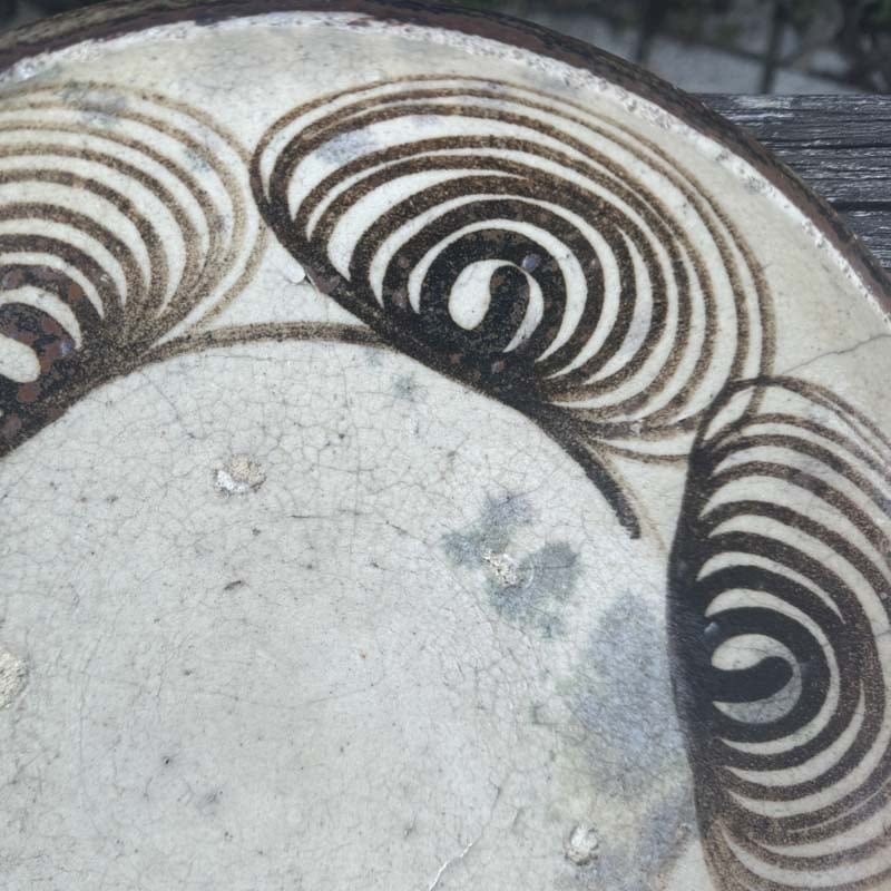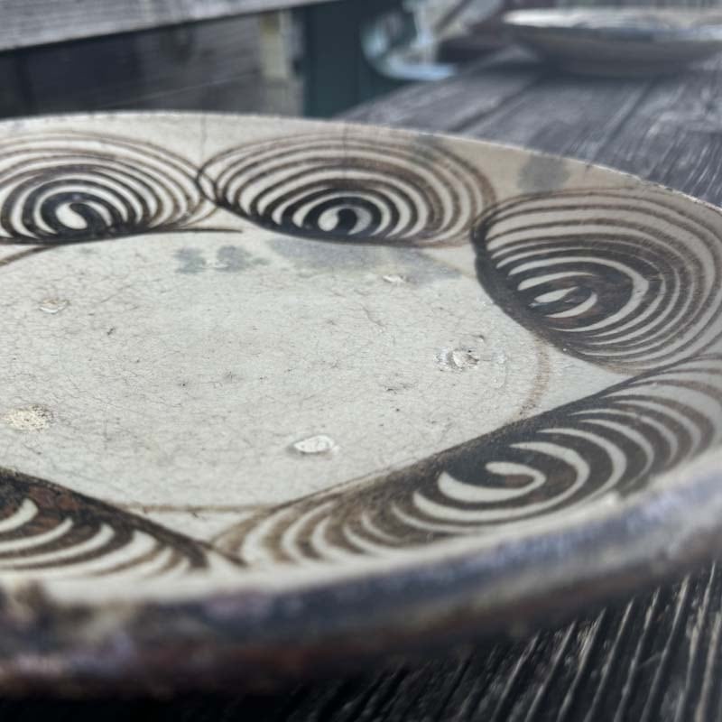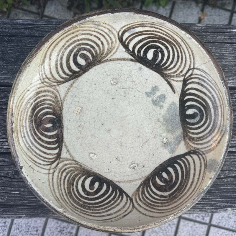 ハイ!馬の目皿に戻って、江戸時代後期に瀬戸・美濃地方で製作された盛りつけ用の皿。渦巻き文を周りに配置する特徴から馬目皿と呼ばれた。幕末から明治初期の物と思われます。馬の目皿の文様は、火難の厄除けであったり、有り余る生命の豊かさを象徴したものらしいとの意味合いも!