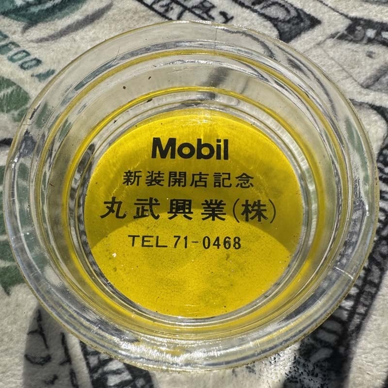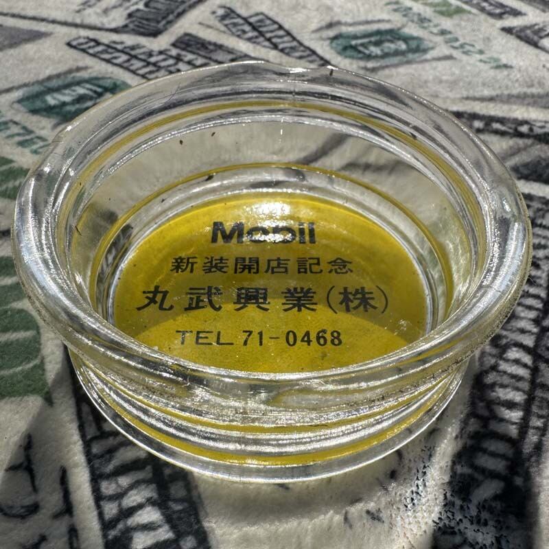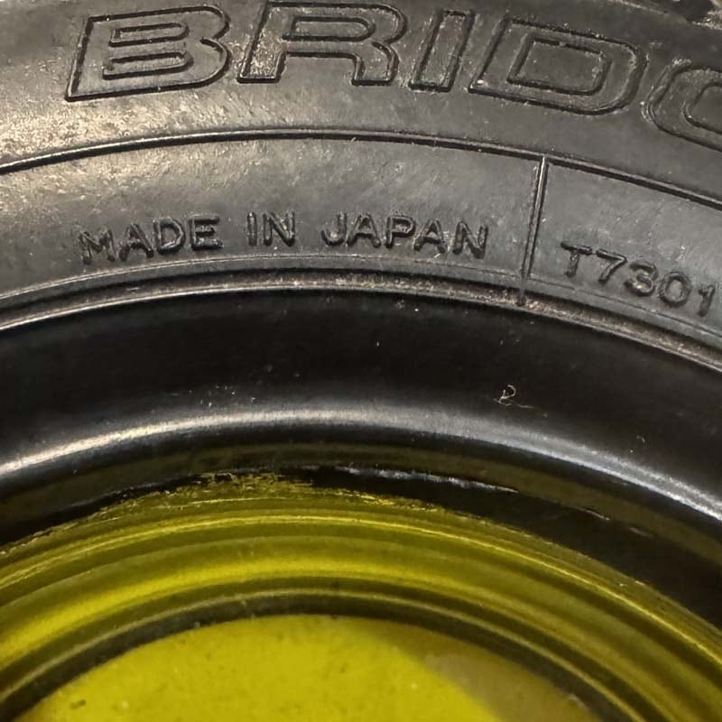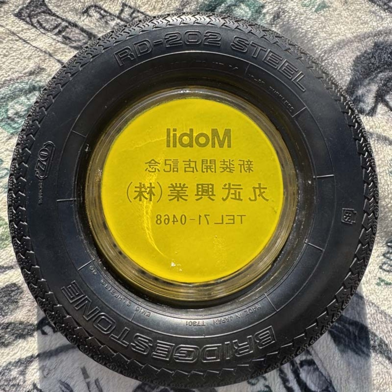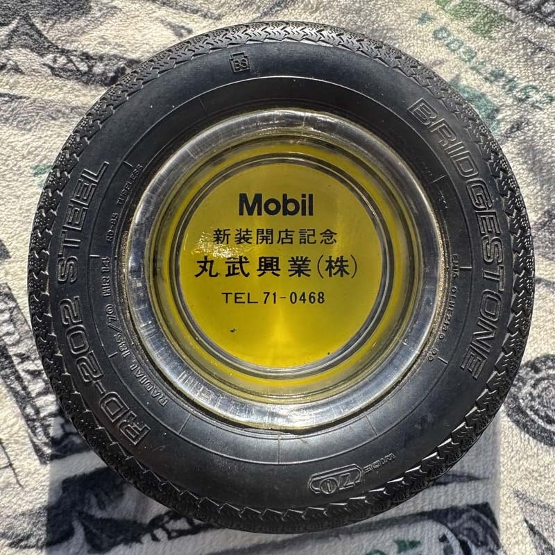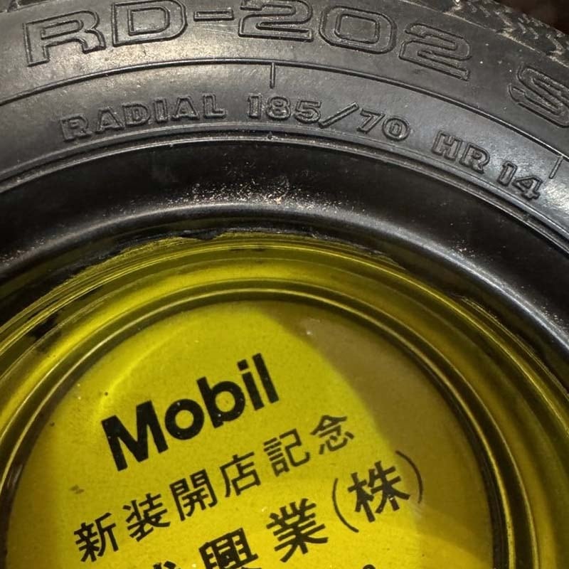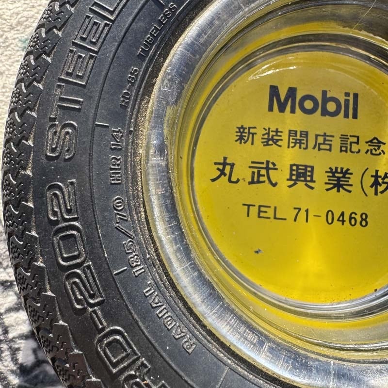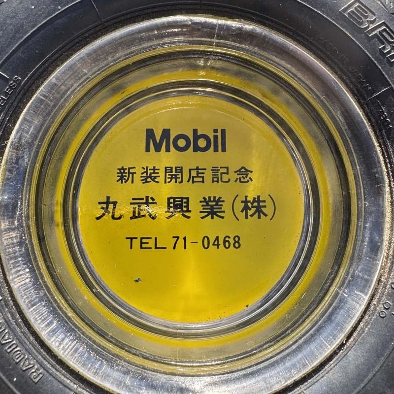 タイヤの部分にはBRIDGESTONE/RD-202 STEEL、MADE IN JAPANの刻印が入っており、中央のガラス部分には、Mobil 新装開店記念 丸武興業(株)、電話番号がプリントされています。