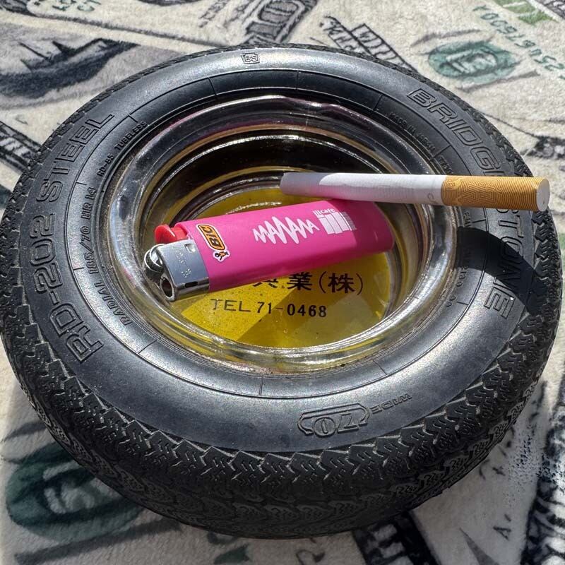 まるで本物のタイヤのようなゴム製のタイヤの中に厚みのあるガラス製の灰皿が入っています。