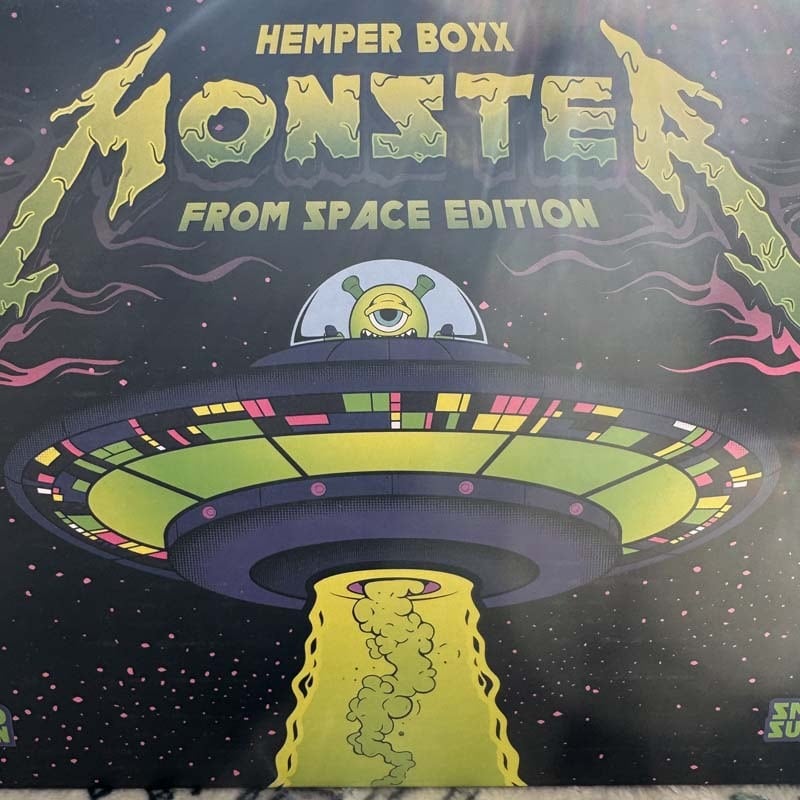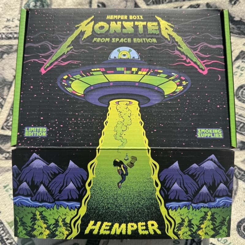 METALLICAのパロディー系デザインで、HEMPER BOXX MONSTER FROM SPACE EDITIONのロゴとUFOに乗った宇宙人のイラストが入った特性ボックスも最高です!