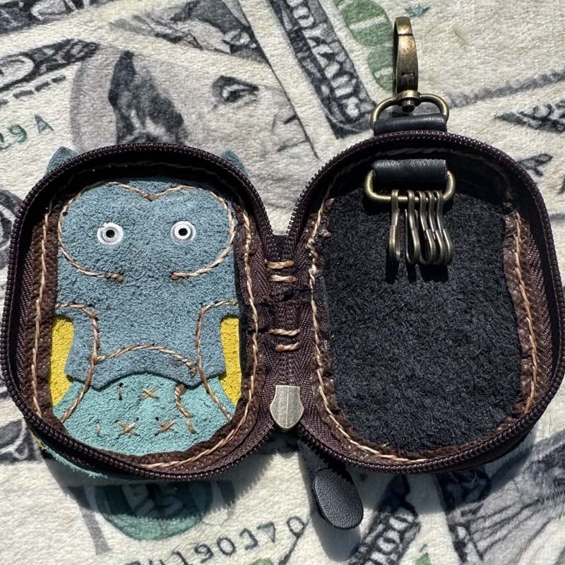 可愛いフクロウのレザー製キーケース、5連キーフック、スマートキーも収納可能、カードポケット付き 牛革、 Owl design Leather Key Case