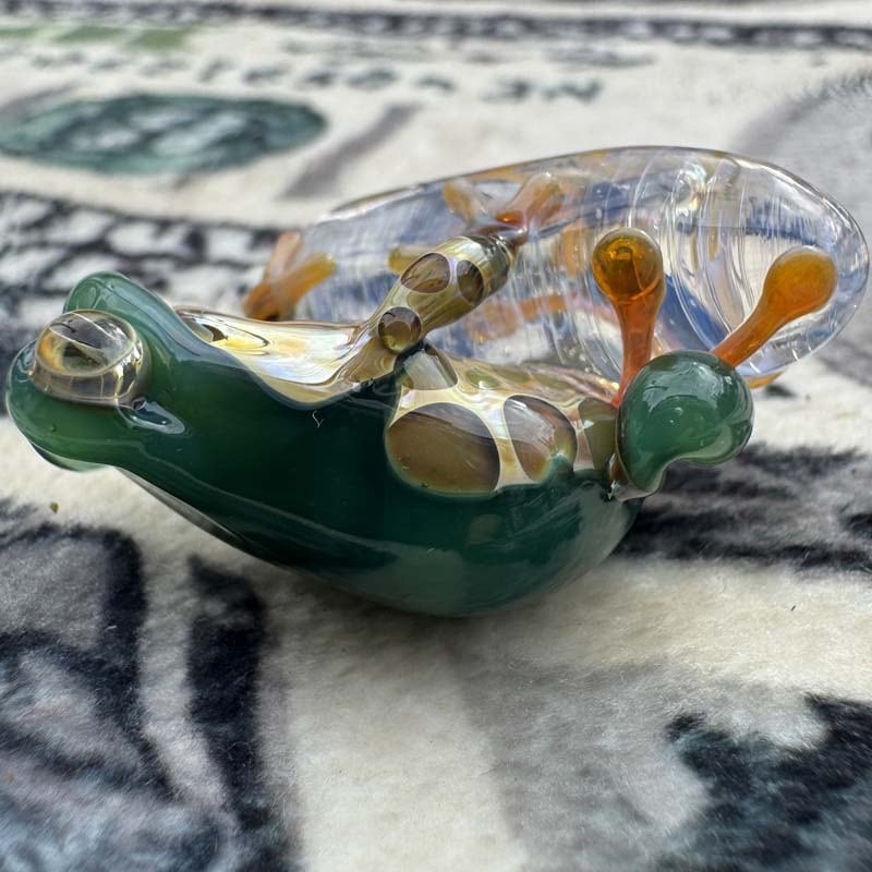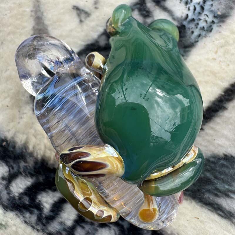 麻覇王 マハオ Frog 蛙 x 水晶 ペンダント N-2284 紐付き Pyrex Glass を使用したアートガラスのネックレス、Green x Goldの蛙