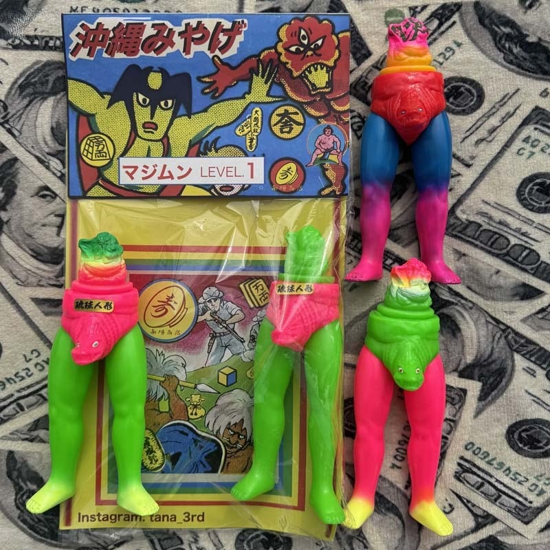 2019年頃 最初は捨てられたオモチャを再利用してリサイクルTOYの製作を開始したTANAさん、その後 ソフビ制作の当初は金型をおこす予算が無かった為下半身だけで制作、その1st モデルのマジムン LVEL1がこちらとなりますw その後下半身が売れたお金で上半身を制作して現在はLEVEL6までリリースされていて上半身や腕、翼なども追加されたり、カスタムフィギュアまで無事リリースされてます。カッケーw