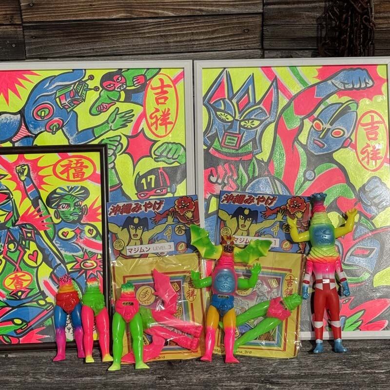 山本KIDも愛した TANAさんの描く 沖縄宇宙大戦争のキャラクターを立体化した、ブート感漂う 変態立体作品 マニャーナの空間にはしっかりと馴染んでますが、かなり異色のカオス感、実際、マニャに訪れたお客さんに見せたら、今までの人生の中で見たフィギュアの中で一番イカツイです と言われましたw