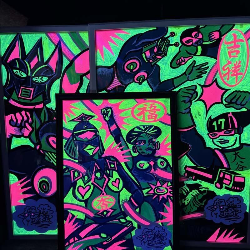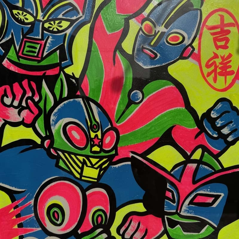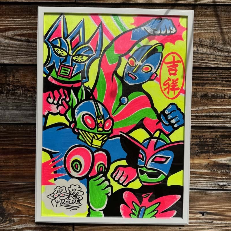 ウルトラマン、〇〇ライダー、〇〇ワンなど昭和レトロなスーパーヒーローが集結 2025 TANAのサインが入る 2025年の作品かと。