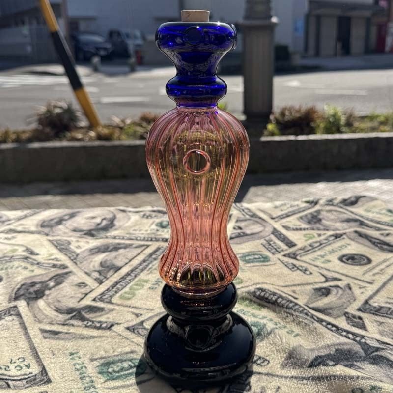 輝いているゴールド(ピンクの部分)を、濃いめのブルーガラスで挟んだデザインで 上下の濃いブルーガラスと中央のピンクのコントラストも高級感抜群!