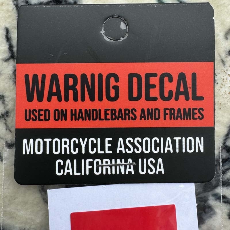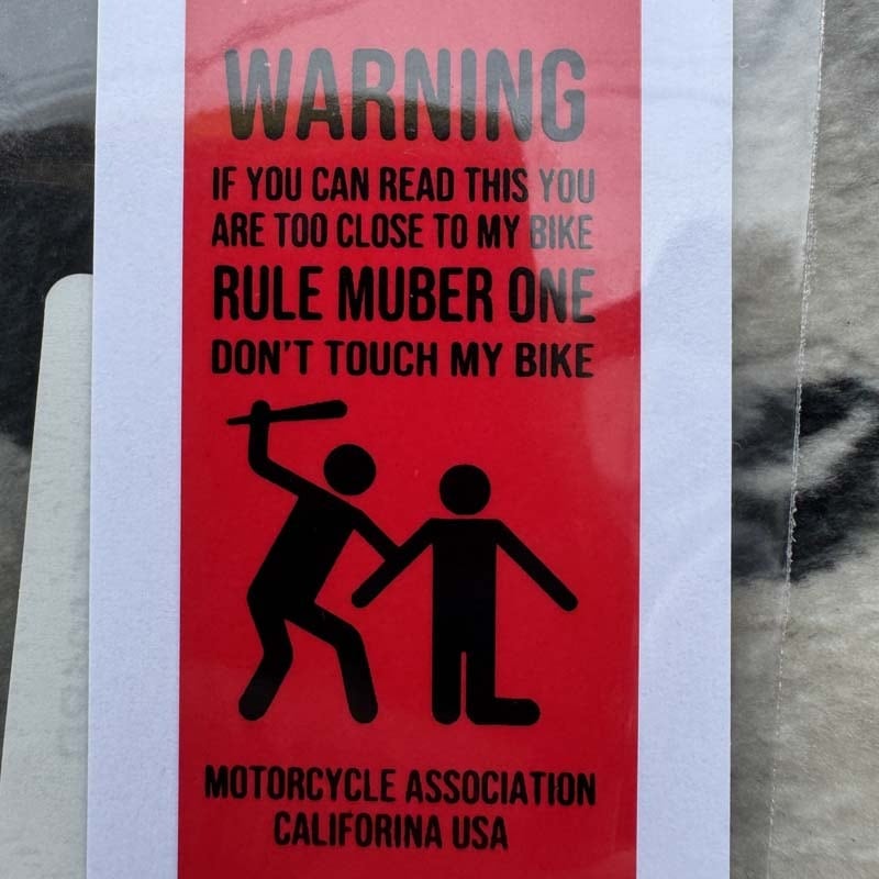 もしこれが読めるならあなたは私のバイクに近過ぎます。私のバイクに触れないでください。モーターサイクルアソシエーション カリフォルニア USAって意味ですが、そんな悪さをしようとしている日本人には伝わらないとは思いますがw、バイオレンスなピクトグラムで少しは伝わるかとw