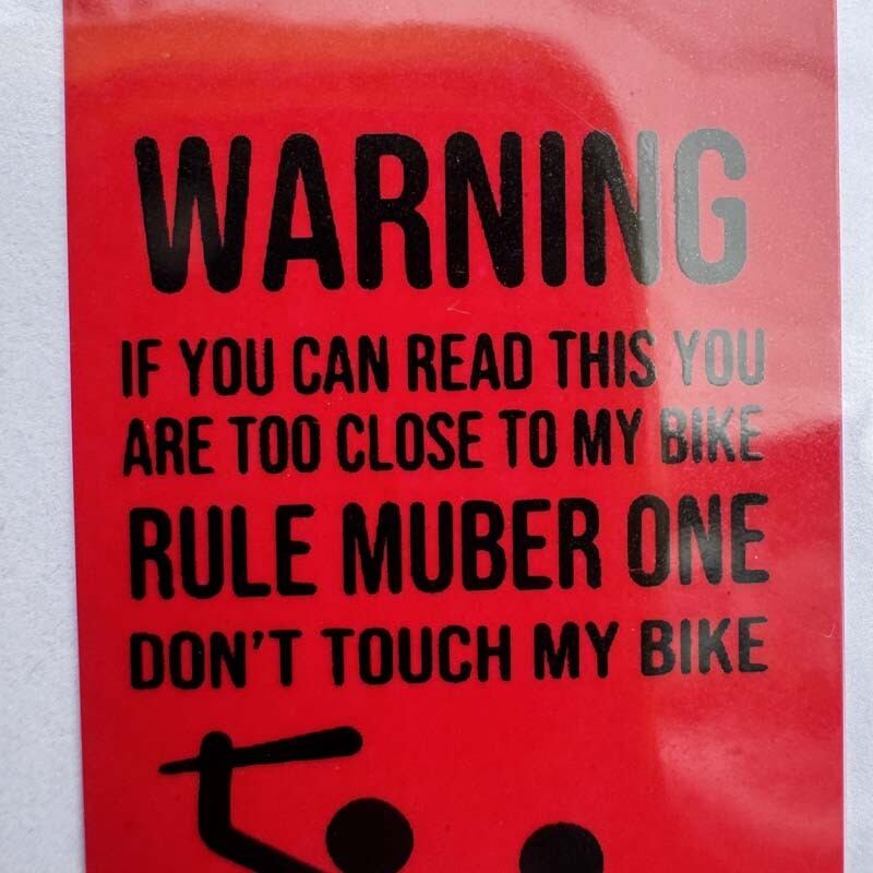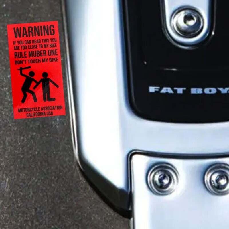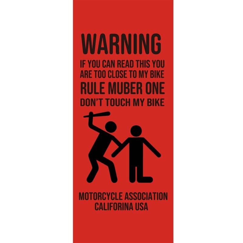 バットで殴ろうとしている人のバイオレンスなピクトグラムと、英語でWARNING IF YOU CAN READ THIS YOU ARE TOO CLOSE TO MY BIKE RULE MUBER ONE DON'T TOUCH MY BIKE、MOTORCYCLE ASSOCIATION CALIFORINA USAのメッセージが入ったステッカーで