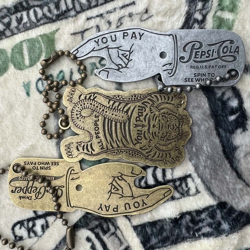 当時、アメリカのドリンク会社のノベルティとして配られてた、みたいで。色んなデザインが存在するみたいです。マニャーナにも、真鍮製、アクリル製のハンドデザイン、ピンナップガールデザインが入荷してるんで合わせて是非、ご検討下さい。
