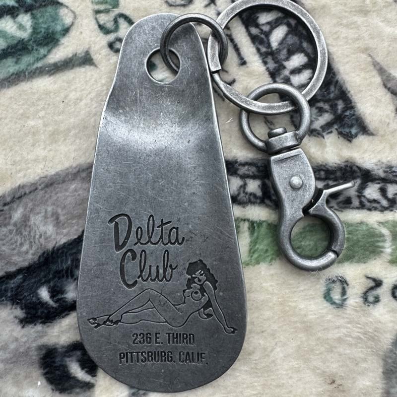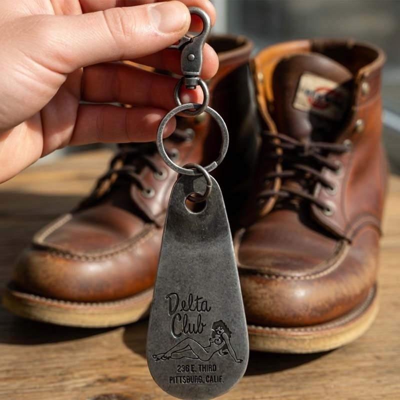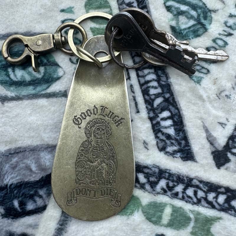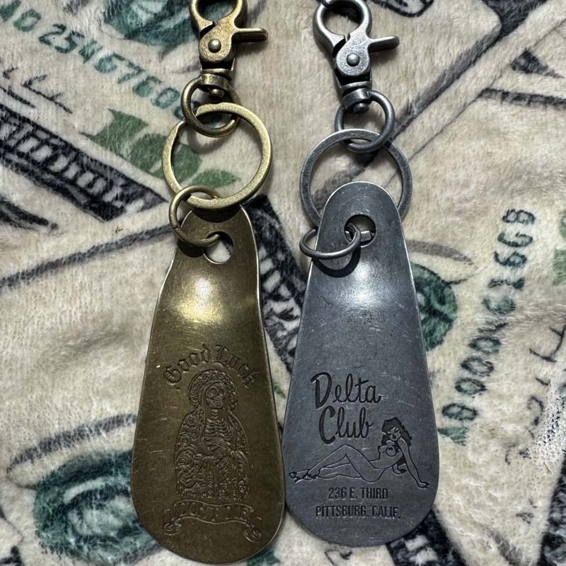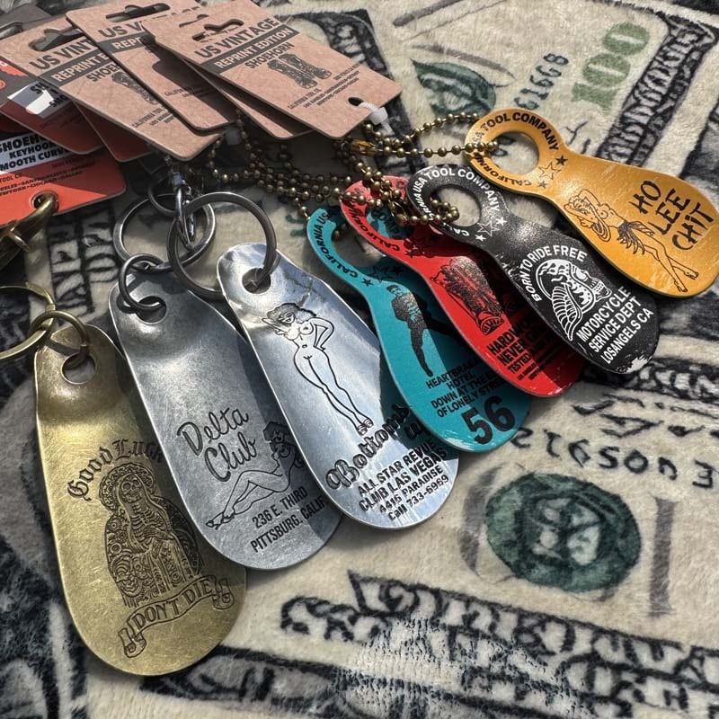 アメリカンビンテージな雰囲気漂うVintage加工&エイジングプリントの靴ベラ(シューホーン)キーホルダー、Gold/サンタ・ムエルテ、Silver/Delta Club、SHOEHORN KEYHOOK