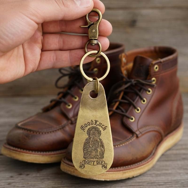 Vintageの風合いをお楽しみ頂けるようヴィンテージと同様に亜鉛合金素材を使用したシューホーンで、 普段はキーホルダーとして使用し、携行することでいつでもシューズの踵をつぶすことなくスマートに履くことができるアイテムです。上部の丸穴の部分に指を引っ掛け靴ベラとして使用すると使い易いです。