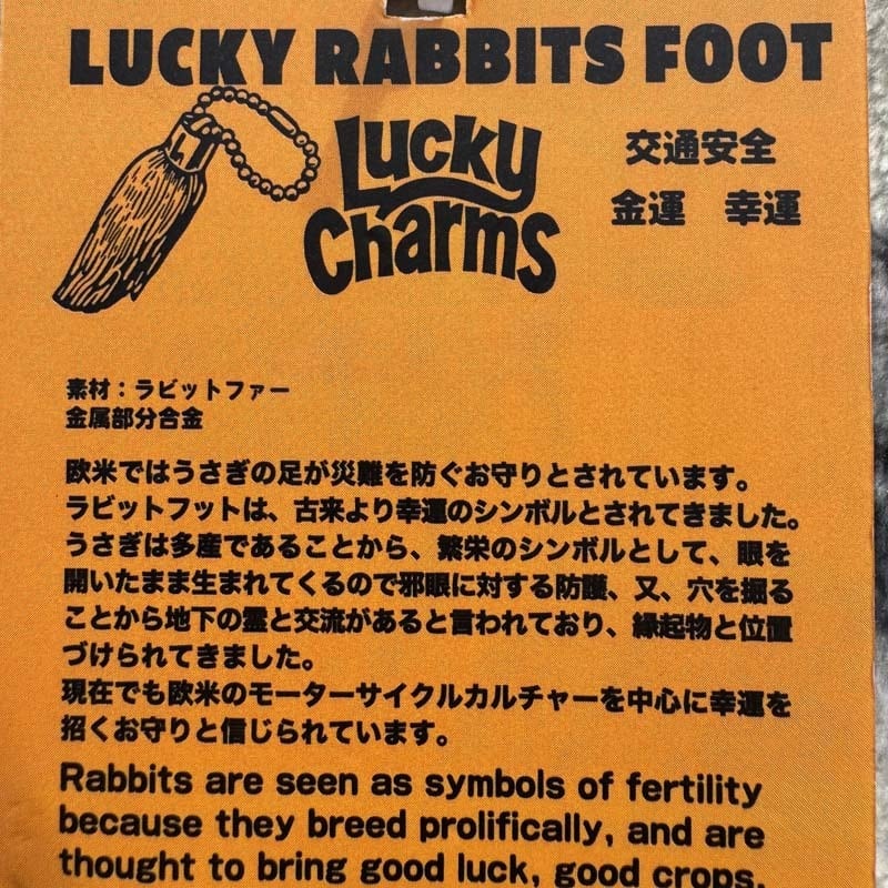 仕掛けた罠、まれにウサギの足だけがかかっている事がある。 でも、辺りにはそのウサギは見当たらない・・・ 足は無くしたが、命まで取られなくてラッキーだと! バイク乗りや、車乗りがもし怪我を負ったとしても、命まで取られない様にと1940年代~1960年代にアメリカのヒッチハイカーやバイク乗りたちの間で流行しました。
