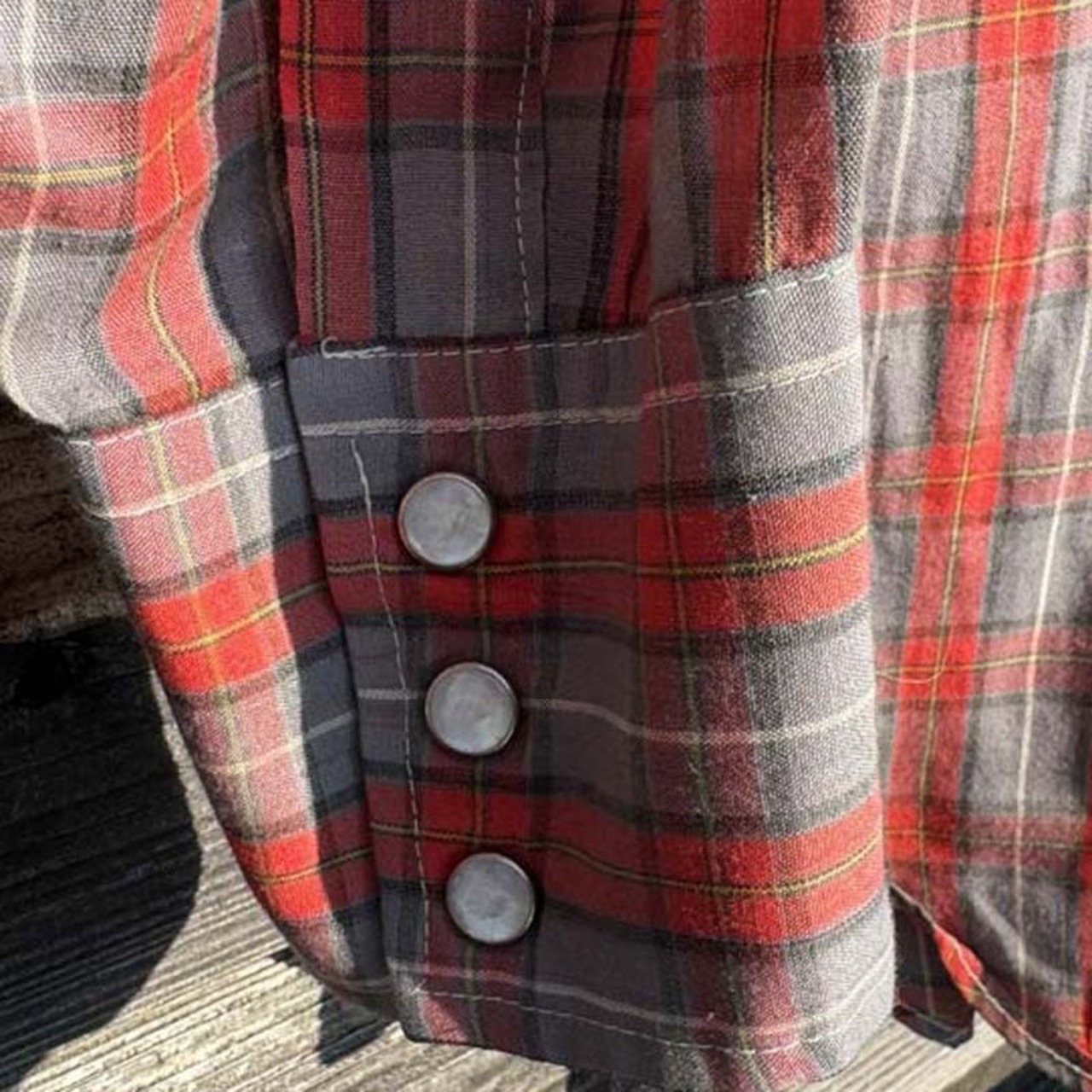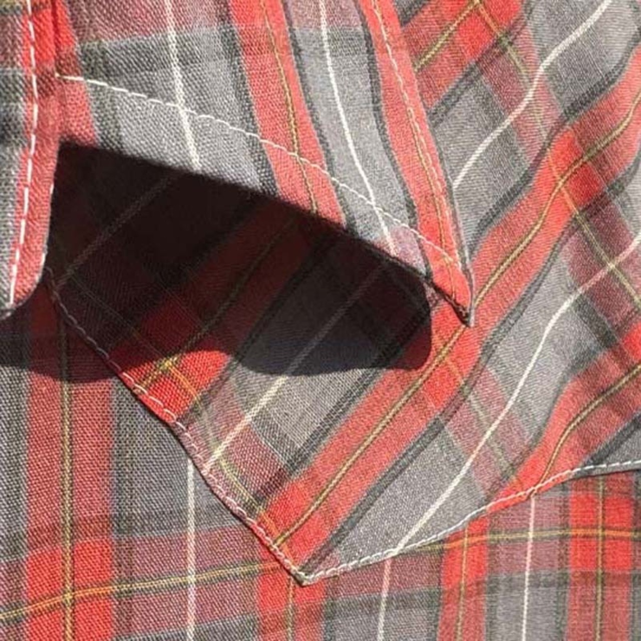 薄手のポリエステルミックスのチェック柄の生地で、フロントの両肩からバックにかけてのヨークの切替し、ウエスタンカットのフラップ付きのポケット、フロント、両胸ポケット、両袖に付く3個のポケット全てをシェル調のスナップボタンを使用するなど、ウエスタンシャツのディティールを備えた一枚!通気性の良い、素材感は快適!