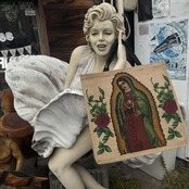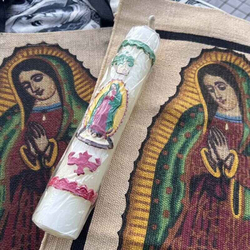 アメリカ テキサス州で購入した 聖母マリアのプリントが入った、ジュート素材のトートバックのご案内。