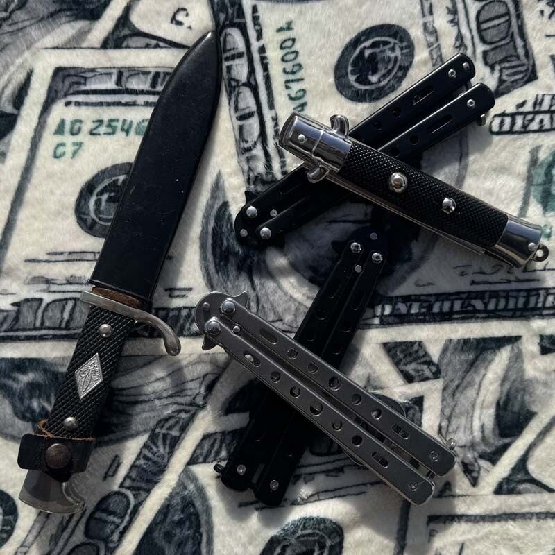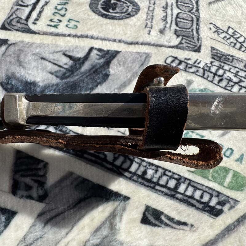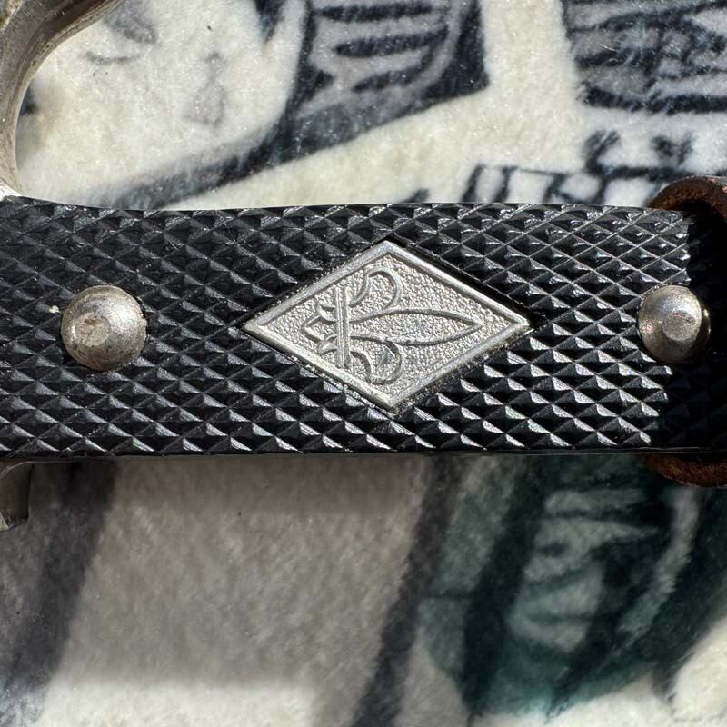 ユリの紋章が入る厚みのあるグリップが男心をくすぐります!分厚いレザーのナイフケースも雰囲気満点。